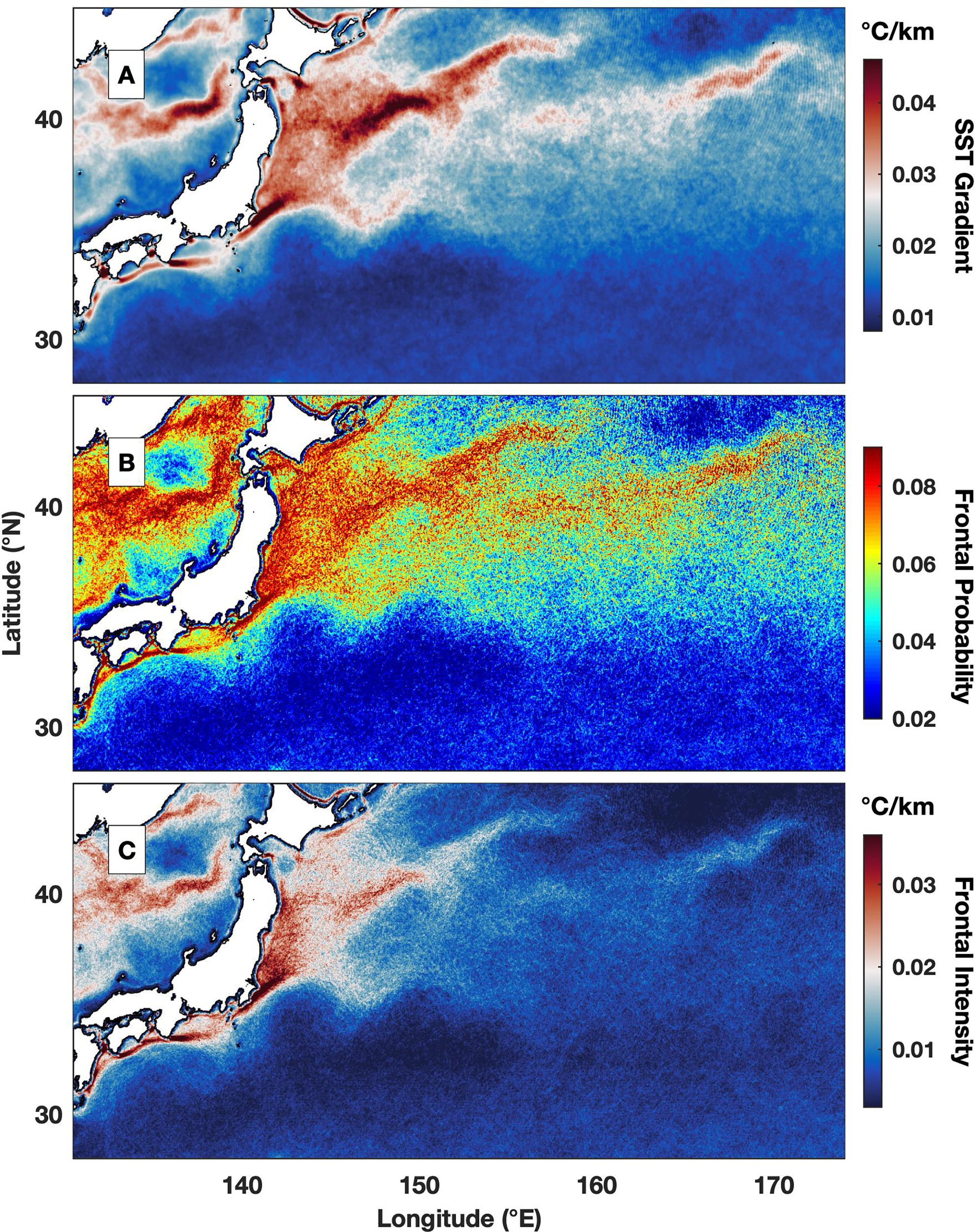 Figure 3 Seventeen-year averaged (A) SST gradient (°C/km), (B) frontal probability and (C) frontal intensity (°C/km) from September 2002 to August 2019.