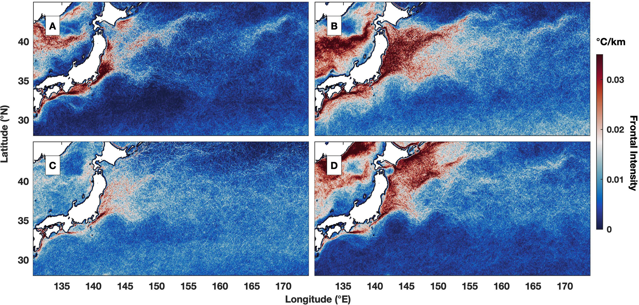 Figure 4 Seasonal averaged frontal intensity (°C/km) for (A) winter (December to February), (B) spring (March to May), (C) summer (June to August) and (D) fall (September to November).