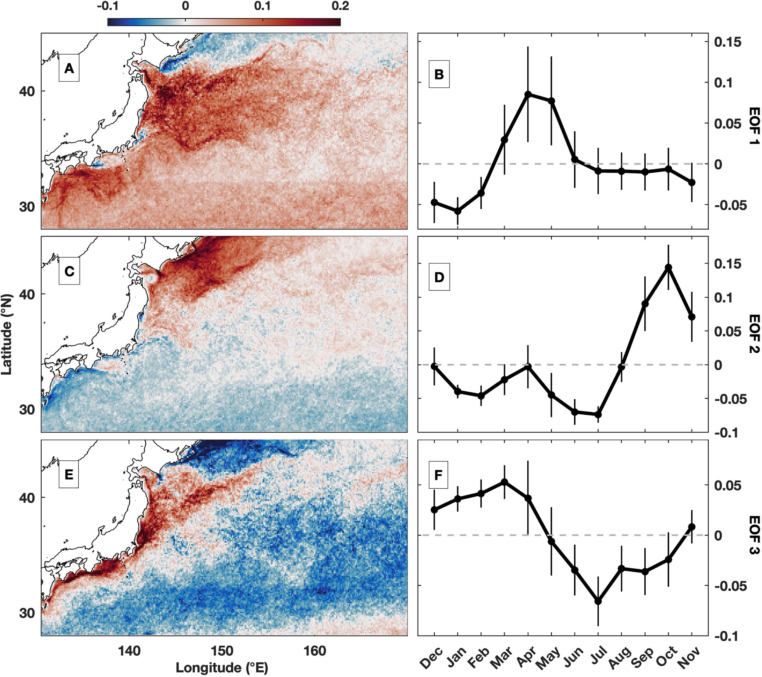 Figure 5 (A, C, E) Spatial magnitude and (B, D, F) temporal amplitude of monthly averaged frontal intensity (°C/km) using the empirical orthogonal function (EOF). The vertical bars in (B, D, F) indicate the standard deviation for corresponding months. The (A, B) first mode, (C, D) second mode and (E, F) third mode of EOFs. The monthly averaged time series in (B, D, F) is set to start in December for easier comparison with Figure 4.