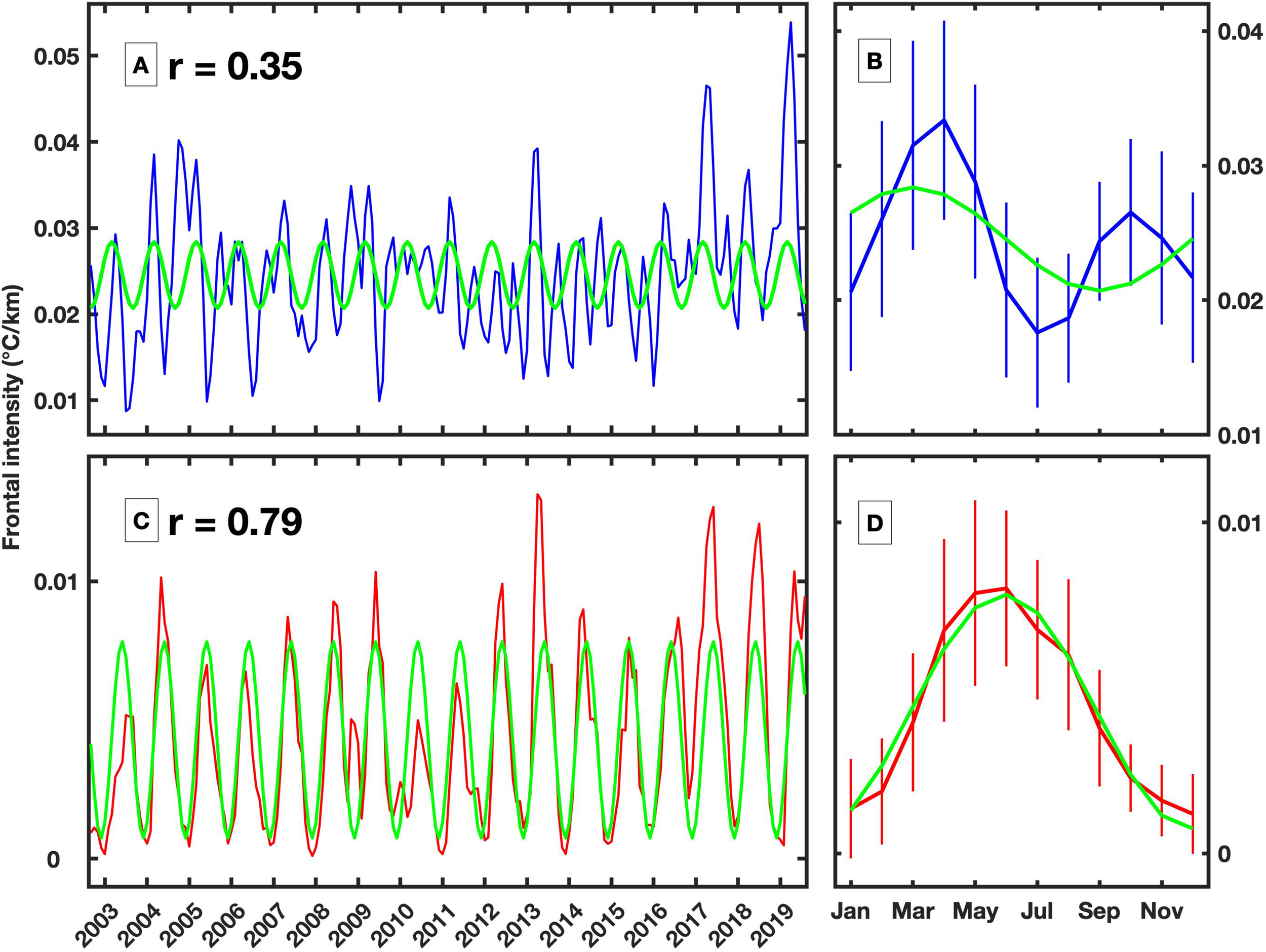 Figure 7 (A) Monthly time series of MFI in the blue region shown in Figure 6C. The green line shows the obtained seasonal cycle of the time series. The correlation coefficient between the monthly time series and seasonal cycles is shown in the figure. (B) Climatological monthly average and associated standard deviation. Panels (C, D) are similar to panels (A, B), respectively, but for the red region shown in Figure 6C.