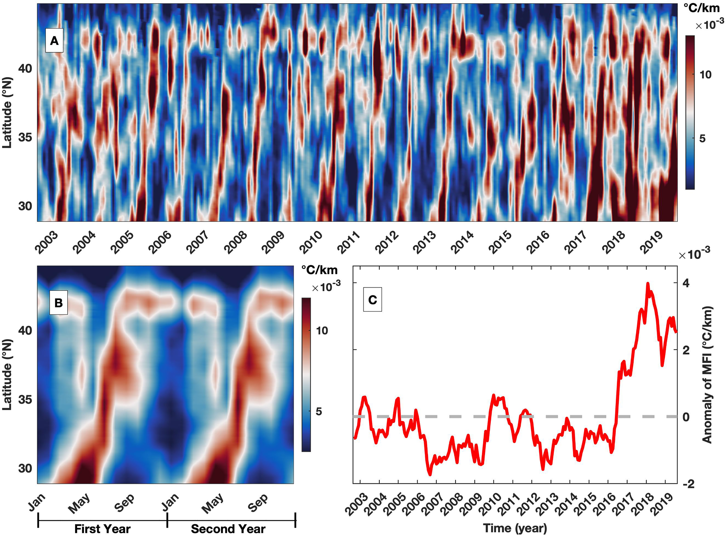To investigate the migration and interannual variability in frontal intensity, the zonally averaged MFI is calculated between 166°E and 171°E (Figure 8A). The Hovmöller diagram shows that the fronts are first generated in the southern region and gradually develop in the northern region. This feature is better revealed in the field of monthly climatological averages (Figure 8B), in which fronts are generated in the southern region, e.g., 29°N, during spring and rapidly extend northward to 35°N until summer. The frontal intensity between 35°N and 41°N is simultaneously elevated in summer, while the frontal intensity in the northern section, e.g., at approximately 42°N, is generally high. The frontal intensity monotonically decreases from south, e.g., 0.015°C/km, to north, e.g., 0.008°C/km. Although the meridional migration of fronts is prominent, the value is much lower than that in coastal regions (Figure 3C). There is also clear interannual variability in the anomaly field, which is quantified by spatially averaging the MFI after removing the monthly climatological average (Figure 8C). The frontal intensity is low between mid-2006 and mid-2009 and between mid-2012 and 2015, while high values are found since. It is interesting to note that the negative anomalies are generally associated with the period when the Kuroshio Extension is characterized by an unstable mode (Qiu et al., 2014). This feature is quite different in the upstream of Kuroshio Extension where the variability in MFI is much larger during unstable mode (Figure 7C) associated with higher frontal probability (Wang et al., 2021b), but the underlying dynamic requires future investigation. The elevated frontal intensity after 2016 can be related to the occurrence of the Kuroshio Large Meander (Sugimoto et al., 2021), associated with the Kuroshio Extension switches to the unstable mode (Qiu et al., 2020), which introduces high instability (Nagano et al., 2019). Thus, fronts are characterized by complex dynamics, including seasonal and interannual variabilities. Similar enhancements in MFI after 2016 are also identified upstream of the Kuroshio Extension (Figure 7).