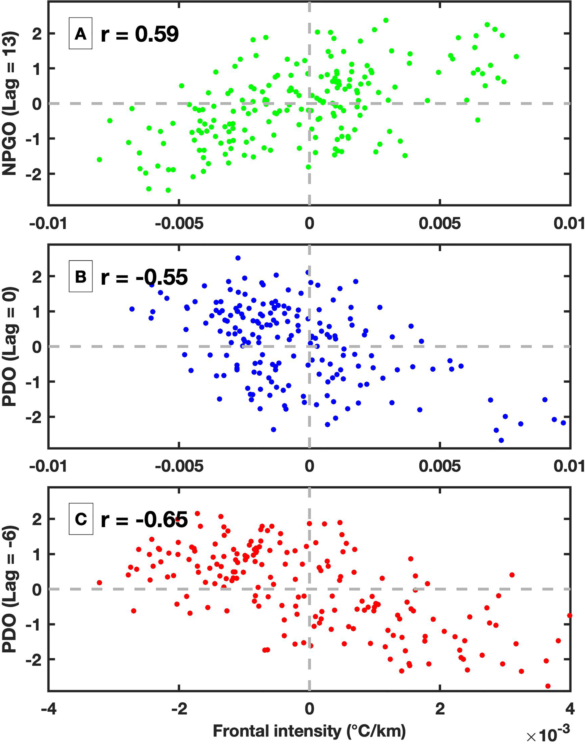 Figure 9 Scatterplot between (A) MFI in the northern region and NPGO index where the NPGO is leading by 13 months; (B) MFI in the southern region and PDO index without lagging; (C) MFI in the eastern region and PDO index where the MFI is leading by 6 months. The applied lag is selected to obtain the largest correlation between two time series. All the correlations are significant at the 95% confidence level. The regions are denoted in Figure 6C.