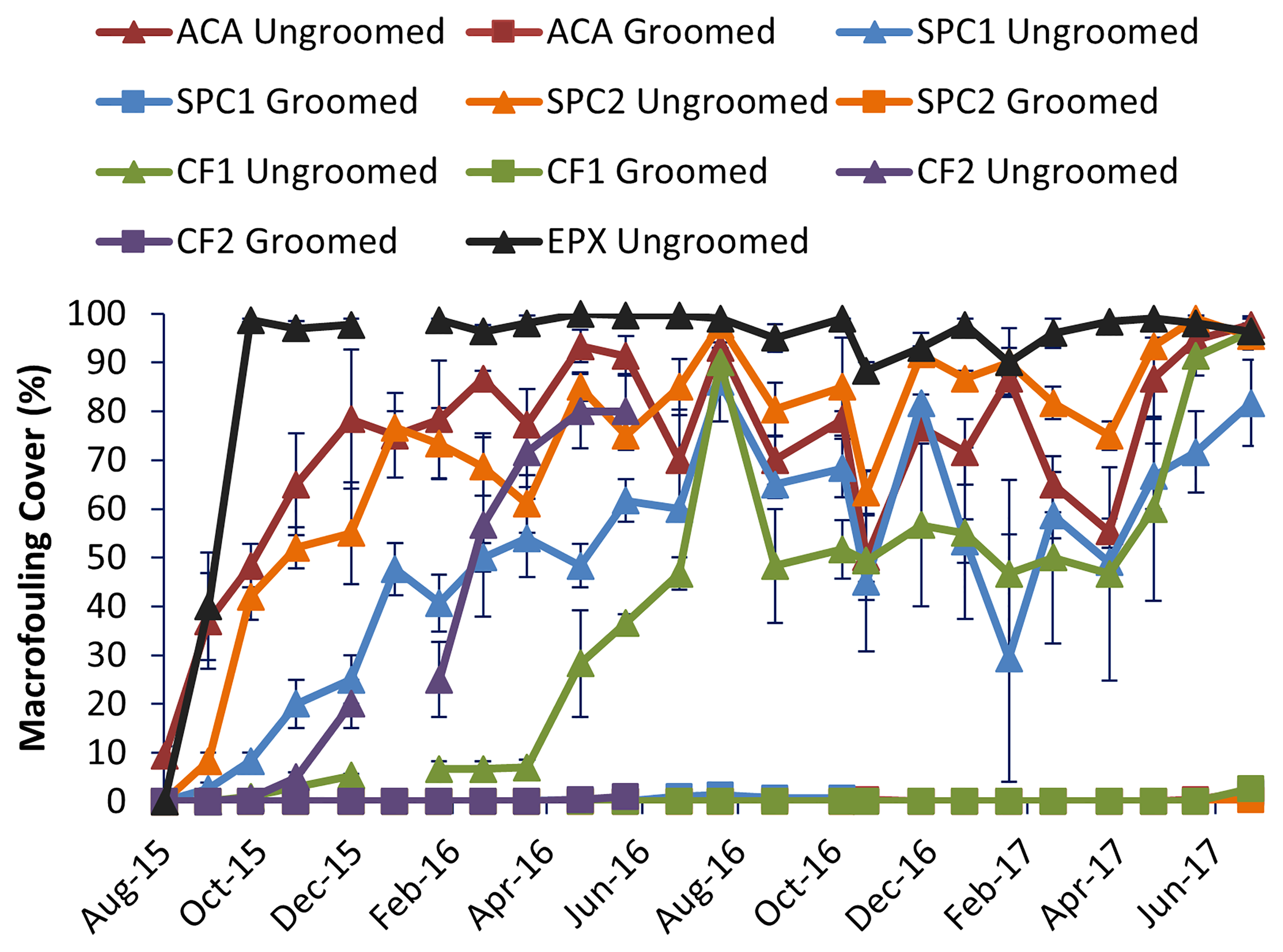 Macrofouling cover was significantly higher on the ungroomed than the groomed surfaces (One-way Anova, p<0.05; Figure 1). Groomed surfaces did not accumulate macrofouling until nearly two years immersion. Ungroomed surfaces began to accumulate macrofouling after only a few months, despite biocides. Epoxy was typically 95% covered with macrofouling and greater, showing that fouling pressure was diverse and high throughout the experiment. The only exception was CF2. This copper-free coating began to accumulate macrofouling on the groomed surfaces after 11 months. Upon closer examination, the groomed replicates had begun to wear through, as shown by the appearance of light colored epoxy barrier coat. Despite this, the groomed surfaces were able to be maintained in a clean condition at least 6 months longer than the ungroomed surfaces.