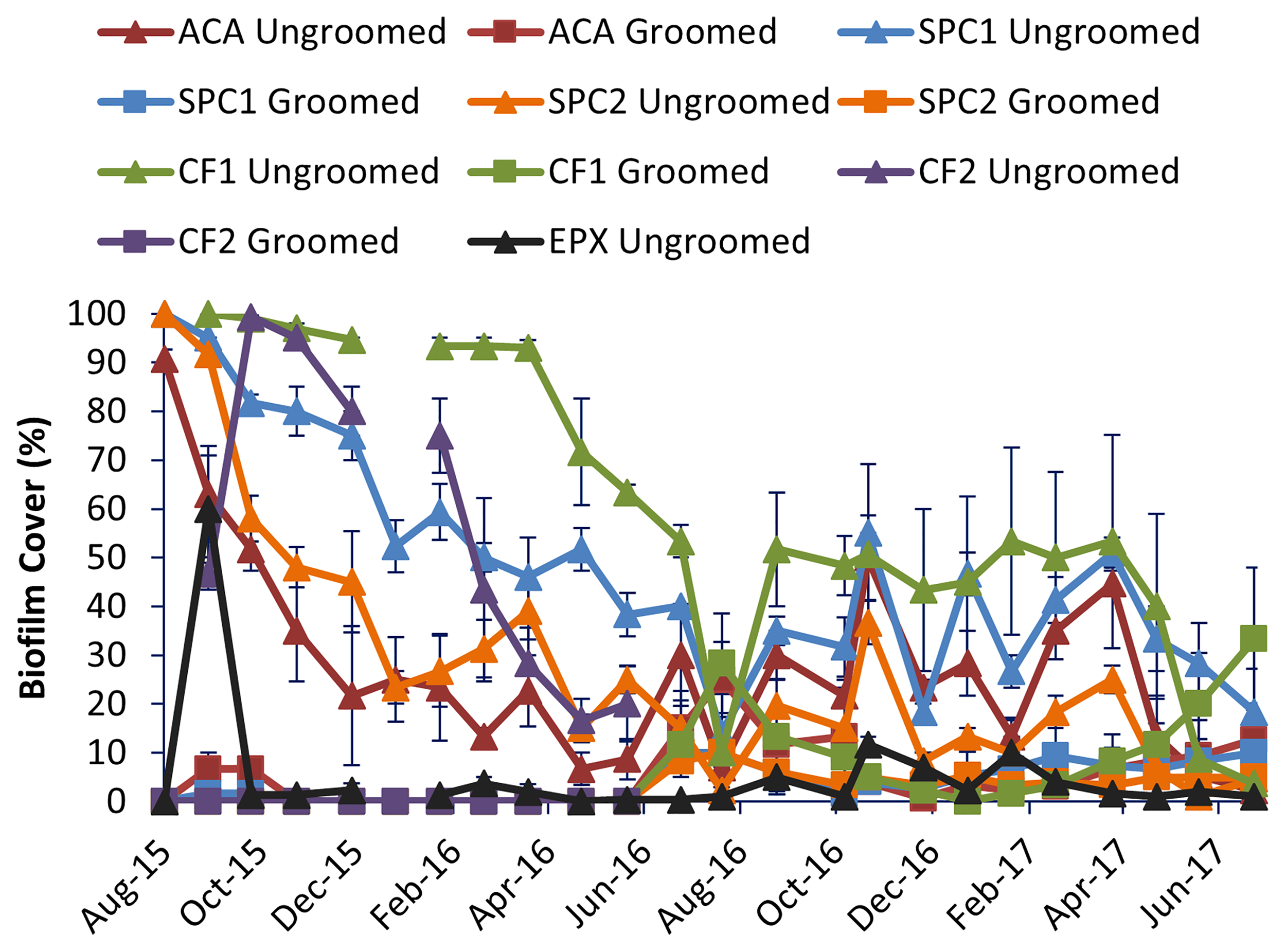 Comparison of biofilm cover among the different coatings. Error bars represent one standard error, n = 3 replicate panels for each coating and grooming condition.
