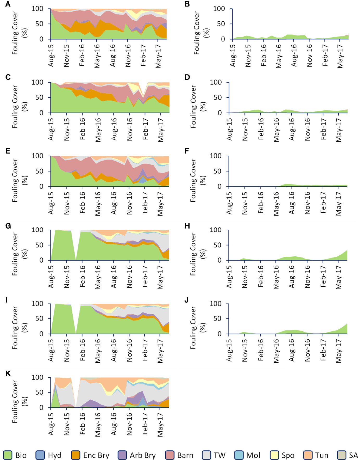 Comparison of fouling composition among the coatings. The left graphs (A, C, E, G, I, K) represent ungroomed surfaces, the right graphs (B, D, F, H, J) represent groomed surfaces. Coating order is as follows: ACA (A, B), SPC1 (C, D), SPC2 (E, F), CF1 (G, H), CF2 (I, J) and EPX (K). Bio, Biofilm; Hyd, Hydroid; Enc Bry, Encrusting Bryozoan; Arb Bry, Arborescent Bryozoan; Barn, Barnacle; TW, Tube Worm; Mol, Mollusc; Spo, Sponge; Tun, Tunicate; SA, Sea Anemone.
