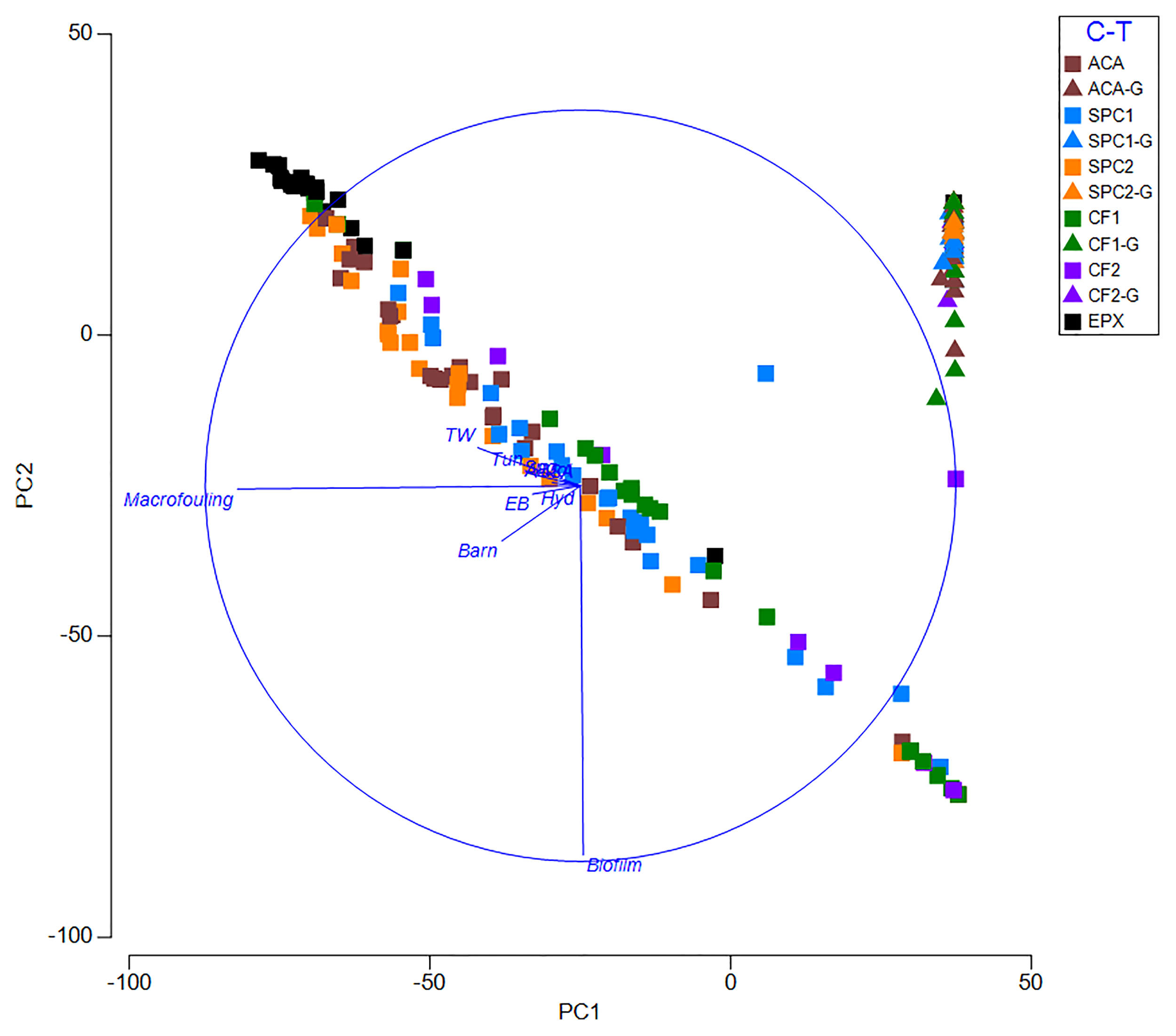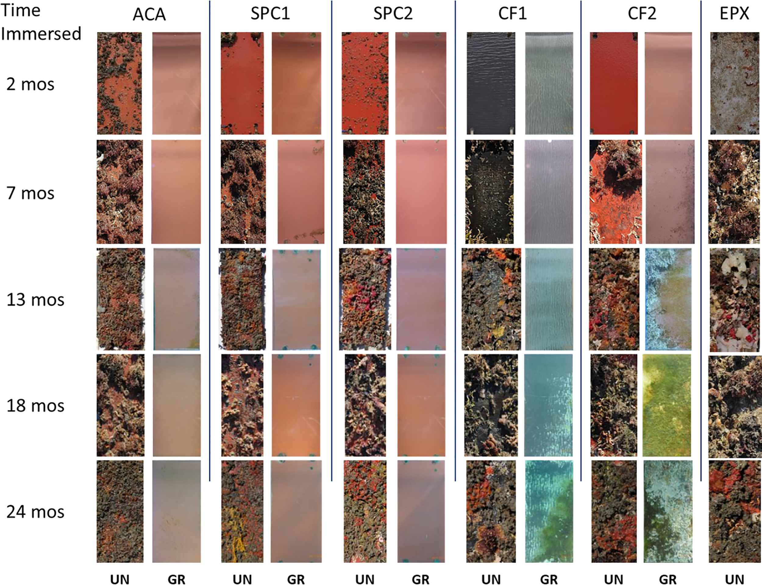 Panels were assessed monthly over the span of two years. The static panels were removed from the water, photographed and visually assessed for percent cover (ASTM D6990, 2020). There are two data gaps (8/15 & 1/16) for the ungroomed CF coatings and the EPX where data was not able to be collected. The grooming panels were photographed in situ by a diver with a camera fitted with a water box. This enabled clear pictures regardless of water clarity and maintained the pictures at a set standoff distance and image size. Photographs were visually assessed in the lab following the same method as the static panels. Results are reported in terms of macrofouling cover and cover of specific taxonomic groups (i.e.: hydroid, encrusting bryozoan, barnacle, etc.). To compare fouling at the community level, a principal component analysis was run on the monthly average cover data. A series of one way ANOVAs was used to compare macrofouling cover and fouling cover by specific taxonomic groups.