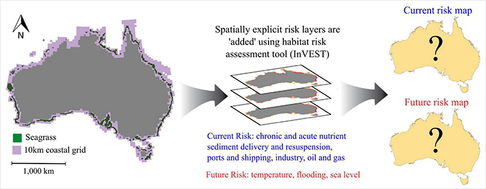 The goal of our study is to perform a spatially-explicit risk assessment of current and future threats to seagrass ecosystems across the Australian continent, incorporating states and bioregions. To achieve this, three objectives were set: (1) to create the first national seagrass map; (2) generate relevant national threat maps and assign risk from these threats; (3) perform a spatially explicit cumulative risk assessment with the map and risk layers. Adopting a national approach enables risk to seagrass habitats to be presented at a spatial scale that is beyond the experience of most stakeholders. We suggest, as Landis (2003) proposed, that operating at these broad scales for risk assessment will allow informed management and conservation decisions. Resources and effort can be focused to mitigate risk to seagrass-dominated coastal habitats and inform where further targeted studies are of most benefit.