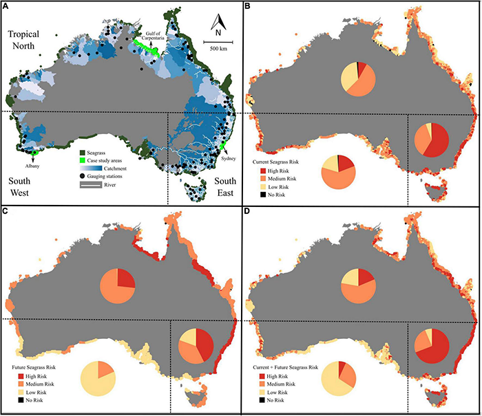 Australia-wide map showing three seagrass bioregions with (A) seagrass habitat, major rivers, size of catchments and case study areas of 30 pixels (as seagrass habitat generally forms a narrow band along the coast it has been expanded to make it visible at this scale), (B) cumulative current risk, (C) cumulative future risk, and (D) current and future risk combined. Pie charts in each bioregion show the proportion of cells with high, moderate or low cumulative risk. Seagrass in the south-east bioregion has higher proportion of high-risk in all scenarios.
