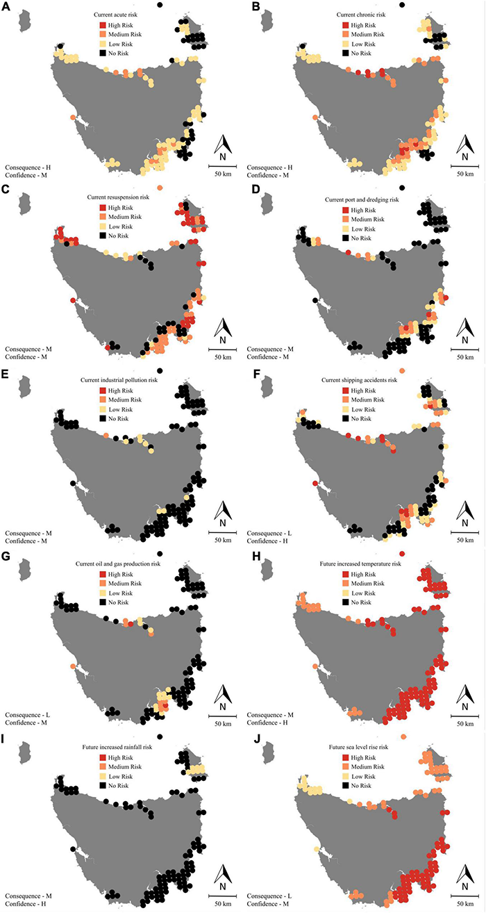An example of how spatially explicit current (A–G) and future (H–J) threats were applied to Tasmania (10 km × 10 km grid cells). Only cells where seagrass is present are shown. The risk of each threat was categorized as high, medium, low or no risk if there was no exposure to that threat. Each threat was weighted based on the consequence of exposure to this threat and the confidence in the threat was assessed through a survey with experts.