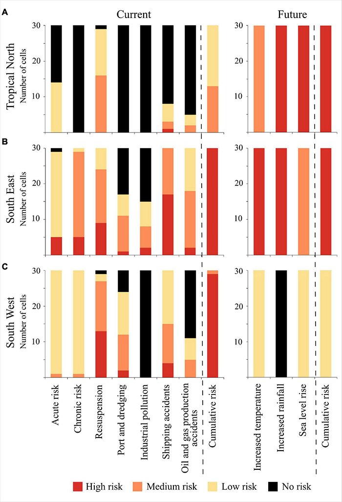 Case study of 30 seagrass cells from each bioregion. (A) Tropical North (Gulf of Carpentaria), (B) South East (Sydney-Newcastle), and (C) South West (Albany) showing the breakdown of individual threats contributing to the current cumulative risk (left) and future cumulative risk (right). A similar cumulative risk (e.g., high) can be derived from different combinations of individual threats.