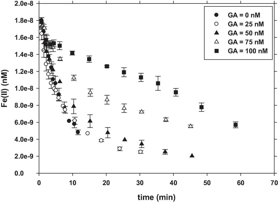 Oxidation of Fe(II) in the presence of GA. Experimental conditions were: [Fe(II)]0 = 25 nM; [GA] = 0–100 nM; pH = 8.0; T = 25°C.
