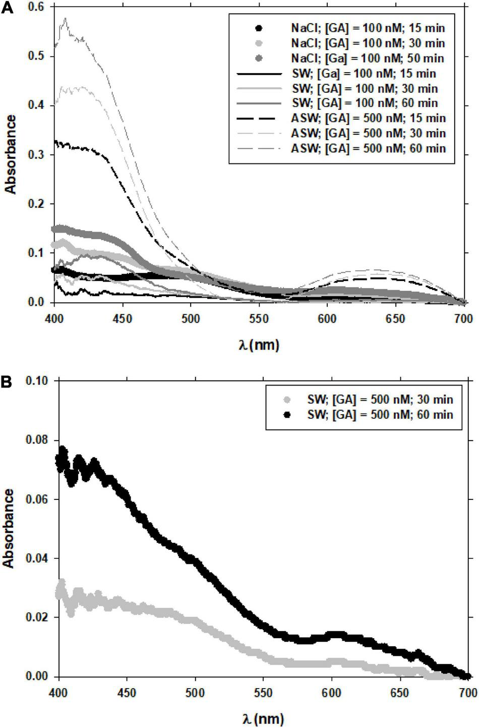 Spectra of GA at 100 and 500 nM in different reaction media. Experimental conditions were T = 25°C, pH = 8.0 (A). Spectra of GA at 500 nM at different times and in seawater. Experimental conditions were T = 25°C, pH = 7.0 (B).