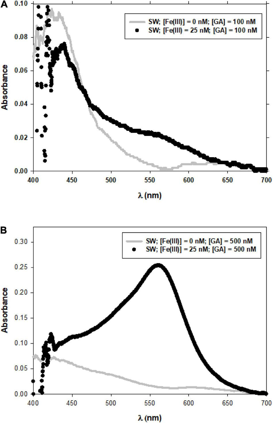 Other aspects that may influence Fe(III) reduction by GA are the acidic species of GA predominant in the medium pH and the degree of GA oxidation at that pH. The acidity constants of GA are: pKa1 = 4.39, due to the carboxylic group and pKa2 = 8.50, pKa3 = 10.3 and pKa4 = 13 due to the three phenolic groups (Eslami et al., 2010; Jabbari, 2015). In the pH range of this study (7.0–8.2) the predominance of the acidic species varies from a practically total predominance of the H3A– species (GA that has given up one proton) at pH = 7.0 to a predominance of approximately 50% for each of the H3A– and H2A2– species (H2A2–: GA that has given up two protons) at pH = 8.0. Considering the different predominance of acidic GA species with increasing pH, the oxidation of GA by oxygen that increases with increasing pH (Strlič et al., 2002; Pant et al., 2019) was important above pH = 7.0 (Strlič et al., 2002), and may also influence the decrease in the rate of Fe(III) reduction with increasing pH. The spectrum of GA after 1 h of bubbling with pure air differs at pH 8.0 and 7.0 (Figures 3A,B, respectively). At pH 7.0 (Figure 3B) and 500 nM GA, the signals at wavelengths close to 430 nm typical of benzoquinone (Hynes and O’Coinceanainn, 2001; Santana-Casiano et al., 2010; Masoud et al., 2014) and 600 nm typical related with quinone (Slawiñska et al., 2007) are much smaller than at pH = 8.0 (Figure 3A), even when compared to the signal with only 100 nM GA.
