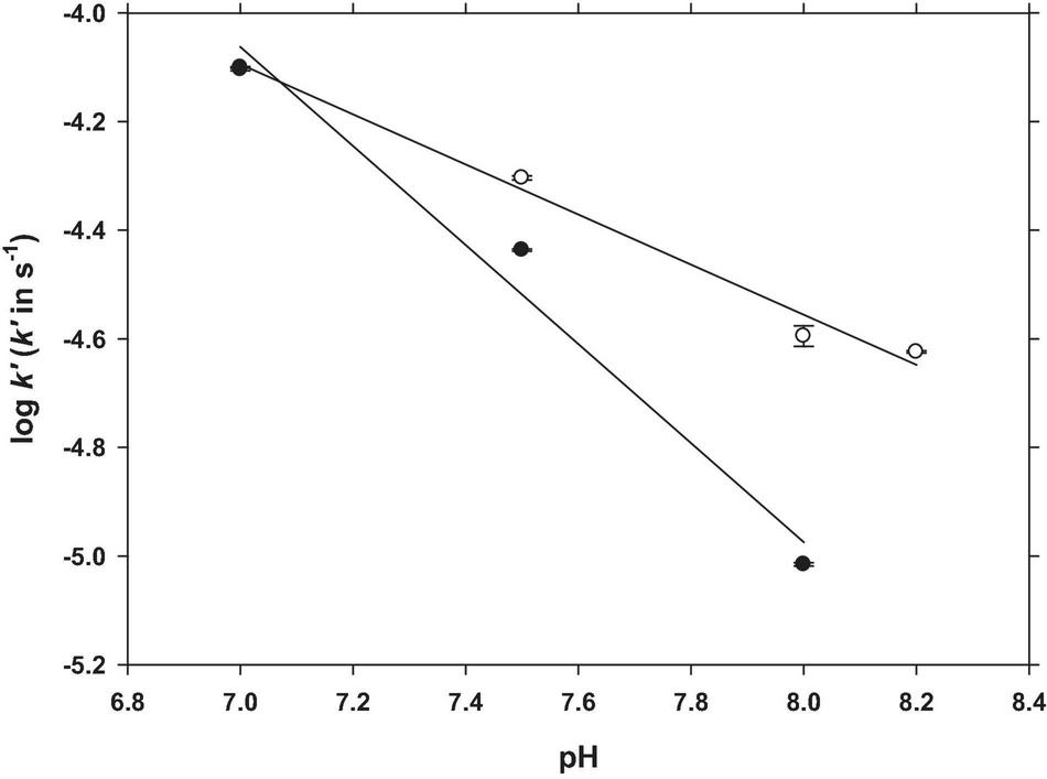 pH dependence of the Fe(III) reduction rate constant in SW (filled symbols) and NaCl-NaHCO3 (unfilled symbols). Experimental conditions were: [Fe(III)]0 = 25 nM; [GA] = 100 nM; T = 25°C.