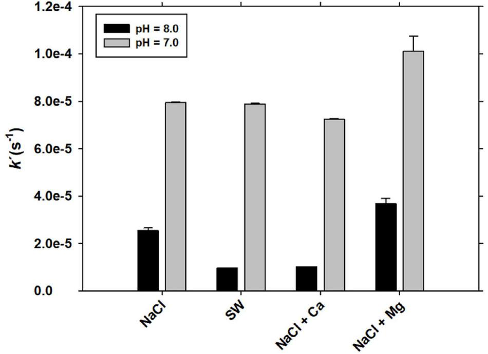 The different slope showed by the reduction of Fe(III) to Fe(II) in NaCl and SW solutions (Equations 2, 3) indicated that major ions in seawater affect the process. Two of the main major ions present in seawater, Ca2+ and Mg2+, were studied at pH 7.0 and 8.0 (Figure 6) with [GA]0 = 100 nM and T = 25°C.