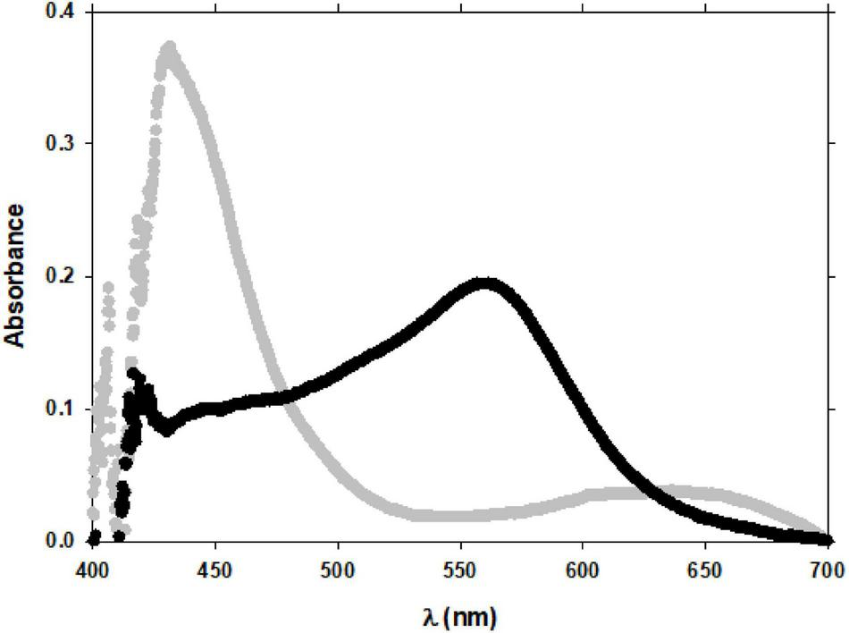 Spectrum of the Fe(II)-FZ3 peak in the presence of GA at pH = 7.0 (black) and 8.0 (gray). Experimental conditions were: [Fe(III)]0 = 25 nM; [GA] = 350 nM; T = 25°C.