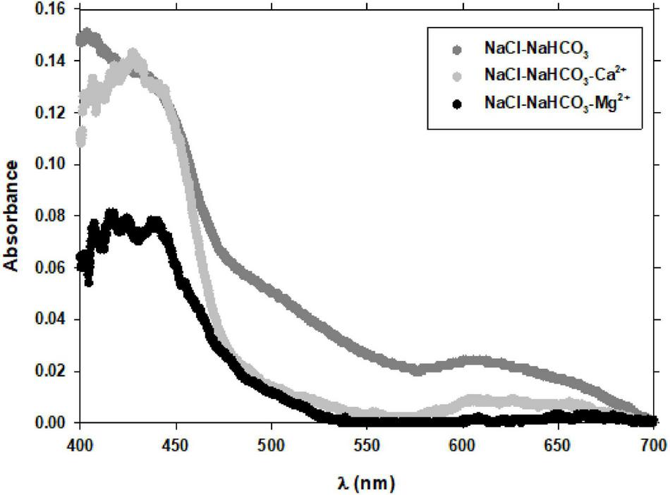 Effect of Ca2+ and Mg2+ ions on the GA spectrum in NaCl (+2 mM NaHCO3). Experimental conditions were: [Fe]0 = 0 nM; [GA] = 100 nM; pH = 8.0; T = 25°C.