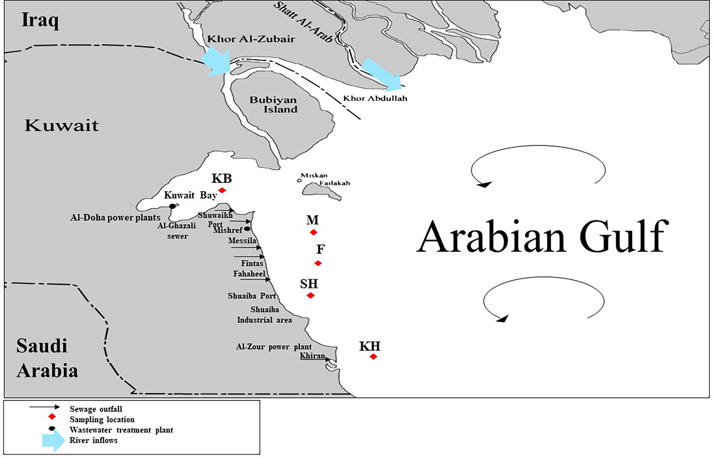 Kuwait map showing the locations of the five sampling sites: Kuwait Bay (KB), Messila (M), Fintas (F), Shuaibah (SH) and Khiran (KH). The map shows the predominant surface water circulation patterns in the Arabian Gulf.