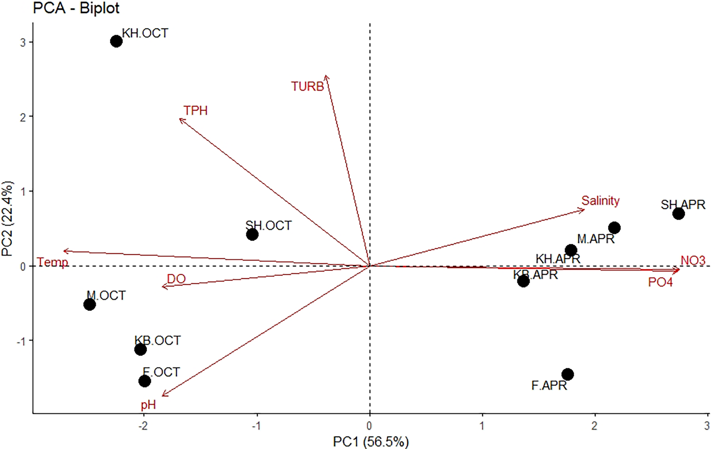 Principal component analysis (PCA) was performed to explore the influence of measured physicochemical parameters at the sampling sites on the distribution of the seasonal samples (Figure 2). The PCA biplot showed a clear seasonal separation between the samples. All spring samples clustered separately from autumn samples and PCA explained 78.9% of the total variance along the first two axes. The first axis (PC1) explained 56.5% of the variability and was positively correlated with salinity, nitrate, and phosphate levels, but negatively correlated with temperature, pH, TPH, DO, and turbidity. The second axis explained 22.4% of the variability and was positively correlated with turbidity, TPH, salinity, and temperature, but negatively correlated with pH, DO, nitrate, and phosphate levels.