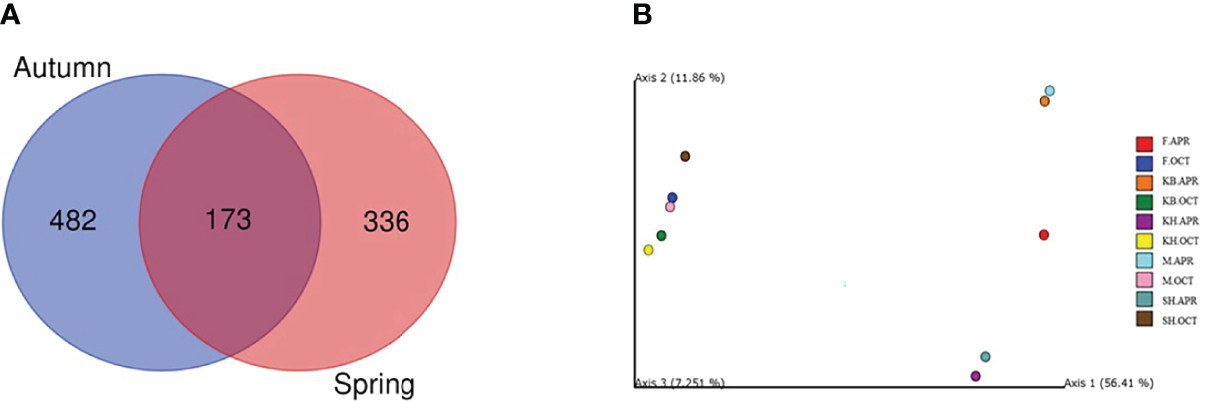 A total of 230,725 high-quality reads were obtained for all the samples and clustered into 991 ASVs. The Shannon rarefaction curves for all samples plateaued, suggesting a sufficient representation of the overall bacterial diversity of the samples (Supplementary Figure 1). The number of ASVs, Shannon, and Pielou diversity indices, as well as the phylogenetic diversity (Faith’s PD) richness index per sample are summarized in Supplementary Table 1. The number of ASVs per site varied between 209 and 252 in autumn, and between 173 and 222 in spring. A Venn diagram was constructed to show the distribution of the total number of ASVs detected across all samples (Figure 3A). The analysis revealed that only 173 of the 991 ASVs were shared among the seasonal samples. In addition, 482 and 336 unique ASVs were identified in the autumn and spring samples, respectively, accounting for 73.5% and 66.0% of the total ASVs, respectively. The bacterial taxa shared among the sites (core microbiome) were represented by 55 ASVs in autumn as well as by 55 ASVs in spring (Supplementary Figure 2).