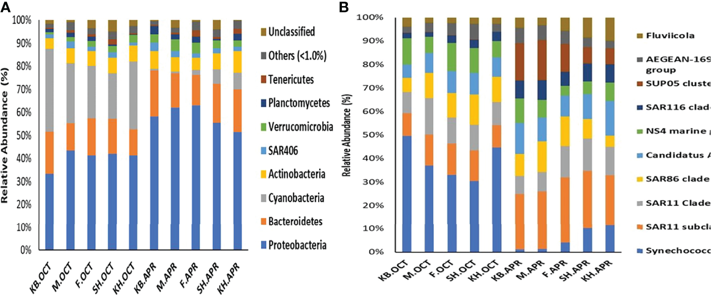 The taxonomic classification identified 19 phyla, 37 classes, 73 orders, 101 families, and 132 taxa. The four most dominant phyla accounted for >87.9 of the ASVs in all samples, and the major phyla were Proteobacteria (49%), Cyanobacteria (16%), Bacteroidetes (16%), and Actinobacteria (7%) (Figure 4A). The relative abundance of Proteobacteria increased in spring, while that of Cyanobacteria increased considerably in autumn. Further classification at the class level revealed that the samples were dominated by five classes: Alphaproteobacteria (30%), Synechococcophycideae (16%), Gammaproteobacteria (14%), Flavobacteriia (13%), and Acidimicrobiia (6%).
