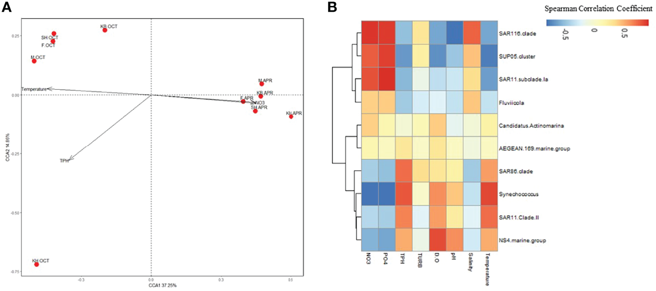 The bacterial alpha diversity and abundance of all major phyla, except cyanobacteria, increased in spring, when the conditions were highly eutrophic. The alpha diversity of bacterioplankton communities in coastal waters usually responds positively to increasing eutrophication levels (Dai et al., 2017). All of the most abundant taxa in this study have frequently been detected in the microbial communities of various marine (Morris et al., 2002; Cram et al., 2015) and coastal (Campbell et al., 2011; Gifford et al., 2014; Campbell et al., 2015) water environments and have been recently detected in heavily impacted polluted shoreline waters (Zimmer-Faust et al., 2021). The top 10 abundant taxa were present at all sites, but in various ratios, which is similar to the identified global patterns of bacterial diversity in surface waters (Pommier et al., 2007; Zinger et al., 2011). Our results showed that four of the top 10 abundant taxa could be recognized as indicator taxa for seasonal samples. Additionally, our results revealed contrasting correlation patterns with temperature, nutrient levels, and TPH, thereby suggesting a coherent response to the surrounding conditions. The patterns obtained mirrored the clear partitioning observed between the seasonal samples in both the PCA and CCA plots (Figures 2, 5A). This also confirms the beta-diversity measures and ANOSIM analysis results, which revealed significant compositional differences between seasonal samples.