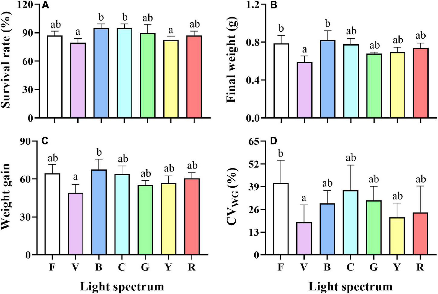 Survival rate (A), Final weight (B), Weight gain (C), coefficient of variation of weight gain (D) of S. paramamosain reared under the different spectra. Values are expressed as means ± SD (n = 3). F, Full spectrum; V, Violet; B, Blue; C, Cyan; G, Green; Y, Yellow; R, Red. Different superscripts denote significant differences between treatments (P < 0.05).