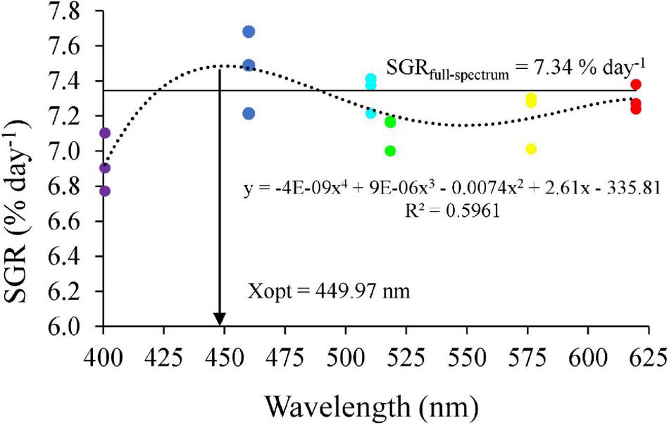 Survival rates in the blue and cyan groups were significantly higher than in the yellow and violet groups but was not significantly different than in the full-spectrum, green and red groups (Figure 2A). Crabs reared under violet had significantly lower Wf and WG than the blue group (Figures 2B,C). No significant differences in Wf and WG were detected between full-spectrum, blue, red, yellow, green, and cyan groups. The coefficient of variation for weight gain (CVWG) was higher in the full-spectrum group (41.1 ± 10.6%) than violet group (18.7 ± 8.1%), but not significantly different than any other groups (Figure 2D). The relationship between light wavelength and SGR based on a 4-parameter saturation kinetic models (4-SKM) showed maximum SGR for spectrum of 449.97 nm (R2 = 0.5961) (Figure 3). No significant differences were detected in CW and BH between treatments (Table 2). However, CL was significantly influenced by light spectrum, with crabs reared under a blue light showing a higher CL than under violet. In addition, there was no significant differences in CF between treatments (Table 2).