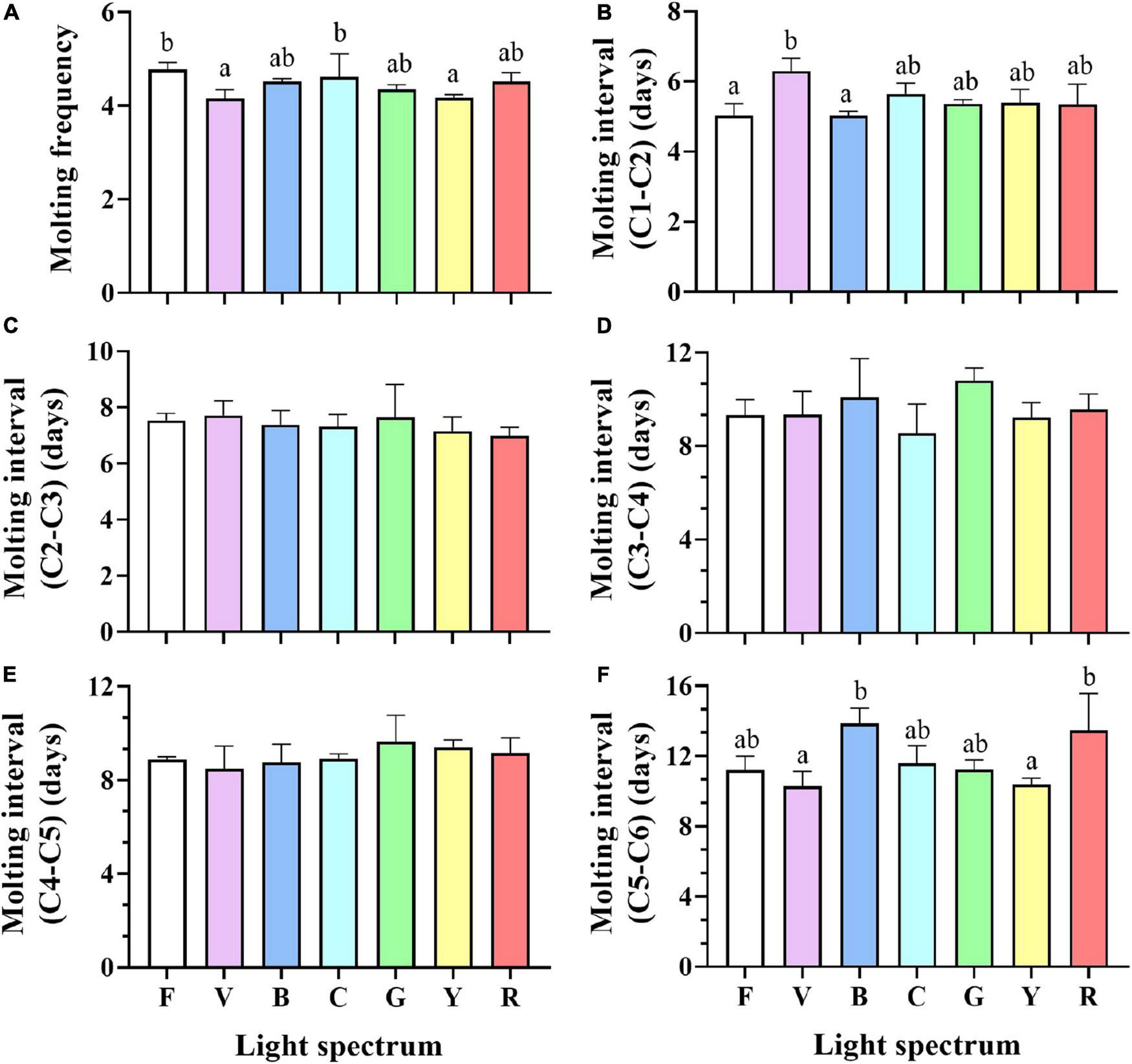 Molting frequency (A), Molting interval (C1-C2) (B), Molting interval (C2-C3) (C), Molting interval (C3-C4) (D), Molting interval (C4-C5) (E) and Molting interval (C5-C6) (F) of S. paramamosain reared under the different spectra. Values are expressed as means ± SD (n = 3, all survival crab per replicate). F, Full spectrum; V, Violet; B, Blue; C, Cyan; G, Green; Y, Yellow; R, Red. Different superscripts denote significant differences between treatments (P < 0.05).