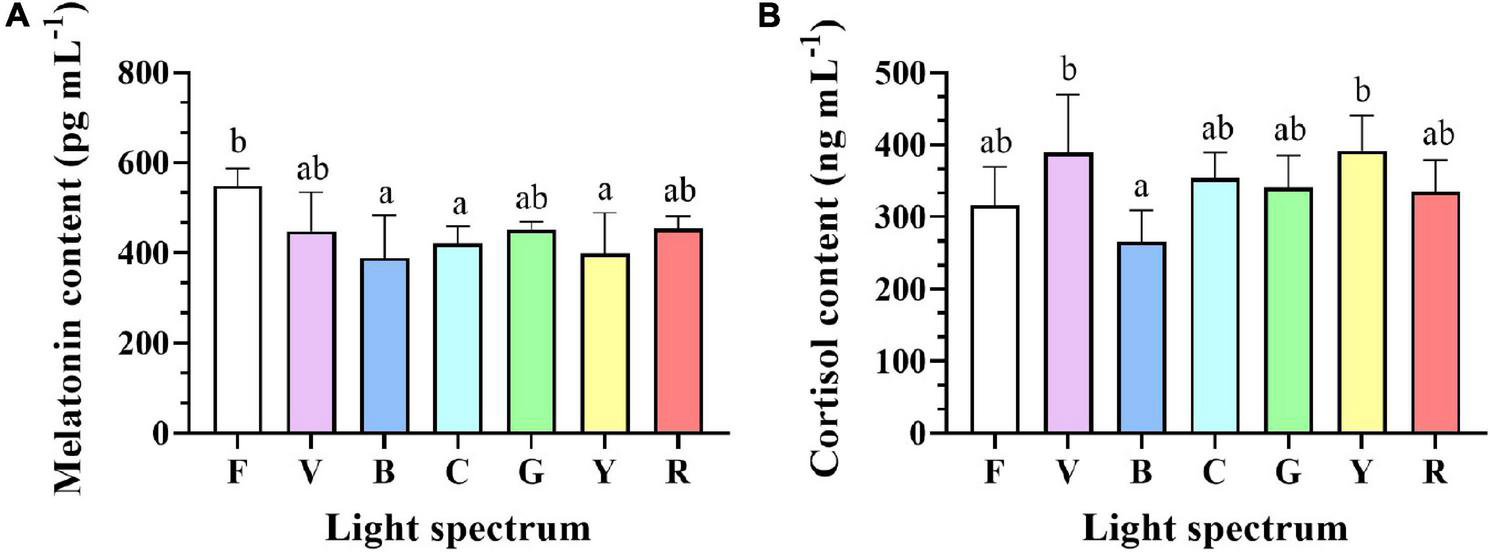 Melatonin (A) and cortisol (B) levels in eyestalks of S. paramamosain reared under various light spectrum. Values are expressed as means ± SD (n = 3, 2 individuals per replicate). F, Full spectrum; V, Violet; B, Blue; C, Cyan; G, Green; Y, Yellow; R, Red. Different superscripts denote significant differences between treatments (P < 0.05).