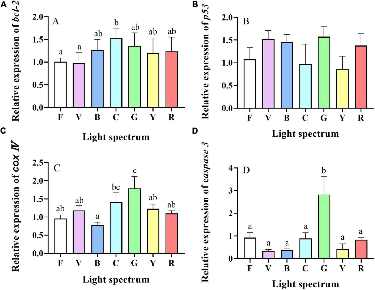 Gene expression of apoptosis-related genes [bcl-2(A), p53(B), cox IV (C) and caspase 3(D)] in hepatopancreases of S. paramamosain reared under the various light spectrum. Values are expressed as means ± SD (n = 3, 2 individuals per replicate). F, Full spectrum; V, Violet; B, Blue; C, Cyan; G, Green; Y, Yellow; R, Red. Different superscripts denote significant differences between treatments (P < 0.05).