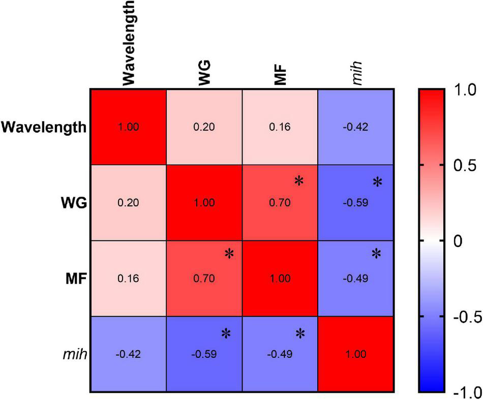 Correlation analyses among wavelength and WG, MF, and relative expression of mih (n = 3, 2 individuals per replicate of mih, and n = 3 replicate; and 34, 31, 37, 37, 35, 32, and 34 individuals per treatment of WG and MF. The “*” indicates P < 0.05.