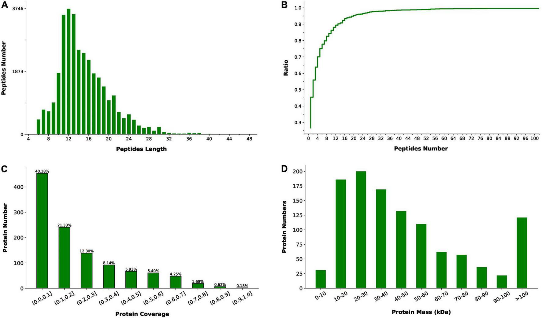 Peptides and proteins identified by liquid chromatography-tandem mass spectrometry (LC-MS/MS) in slow-twitch muscle and fast-twitch muscle of P. dentex. (A) Length distribution of the identified peptides. Peptides length is the number of amino acid residues. (B) Number distribution of unique peptides. The ratio (y-axis) represents the cumulative proportion of proteins containing unique peptides to the total proteins as the number of unique peptides increases. (C) Coverage of identified peptides to the entire protein sequence. The x-axis represents the interval of protein coverage (the length of the protein covered by the detected peptide/the full length of the peptide). The y-axis represents the number of proteins corresponding to the interval. (D) Distribution of identified protein molecular weight.