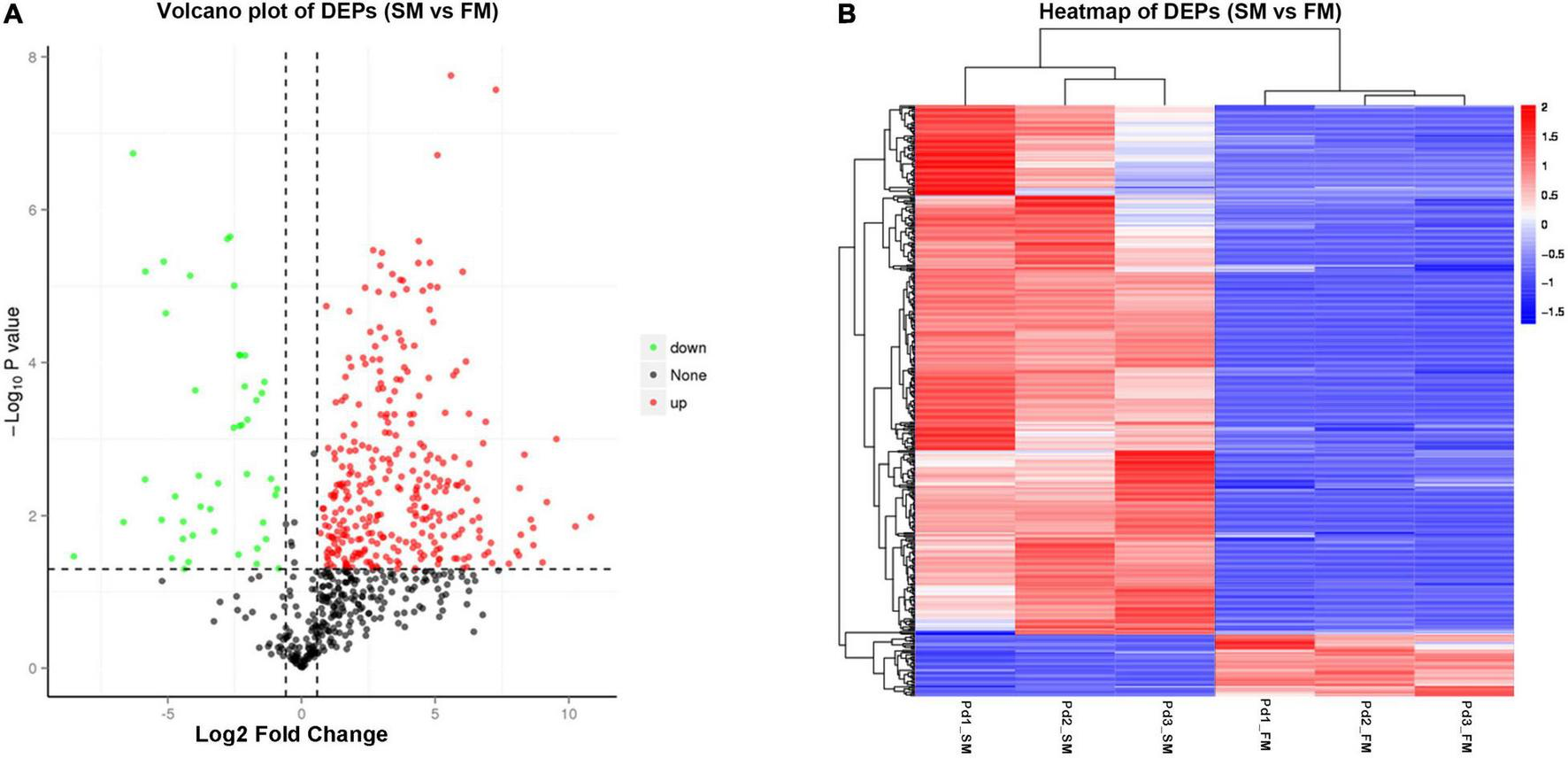 Differentially expressed proteins (DEPs) between slow-twitch muscle and fast-twitch muscle in P. dentex. (A) Volcano plot of DEPs. Red dots represent proteins with significantly higher expression levels in slow-twitch muscle, while green dots represent proteins with significantly higher expression levels in fast-twitch muscle (fold change ≥ 1.5 and p < 0.05). (B) Hierarchical cluster heatmap of DEPs. Red represents upregulated proteins, while blue represents downregulated proteins. The color intensity changes with the protein abundance, as commented in the key bar on the upper right. Pd1, Pd2, and Pd3, the three biological replicates; SM, slow-twitch muscle; FM, fast-twitch muscle.