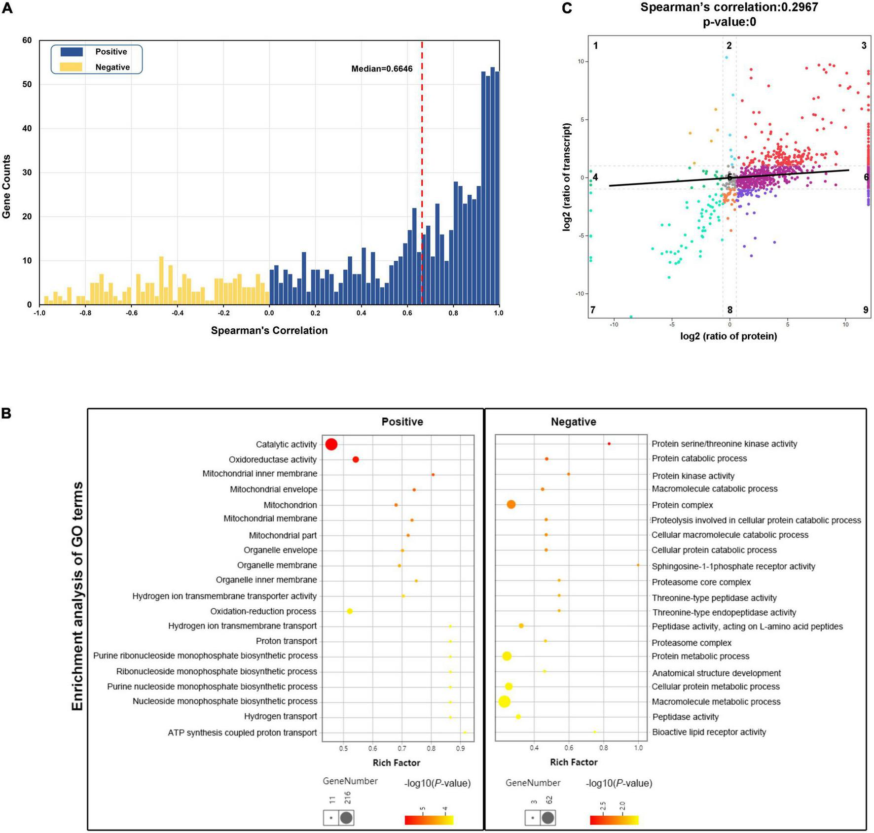 Integrative analysis of transcriptomic and proteomic data. (A) Correlation between RNA and protein abundance for 948 RNA-protein pairs across six samples. Blue bars represent positively correlated RNA-protein pairs (n = 757), while yellow bars represent negatively correlated (n = 191). The red dashed line represents the median value of Spearman’s correlation coefficient. (B) Gene Oncology (GO) enrichment analysis of the strong positively correlated genes (n = 366, Spearman’s correlation coefficient > 0.8) and negatively correlated genes (n = 191). The rich factor of x-axis indicates the number of enriched genes associated with the given GO term divided by the total number of input genes. (C) Correlation of fold change in protein abundance against RNA expression for all RNA-protein pairs. The black line represents linear curve fitting. Dots in the first, third, seventh, and ninth quadrants represent the genes with significant changes in both RNA (fold change ≥ 2) and protein expression (fold change ≥ 1.5). Dots in the second and eighth quadrants denote significant changes in RNA expression levels only. Dots in the fourth and sixth quadrants only show significant changes in protein expression levels. Dots in the fifth quadrant represents no significant changes in either RNA or protein.