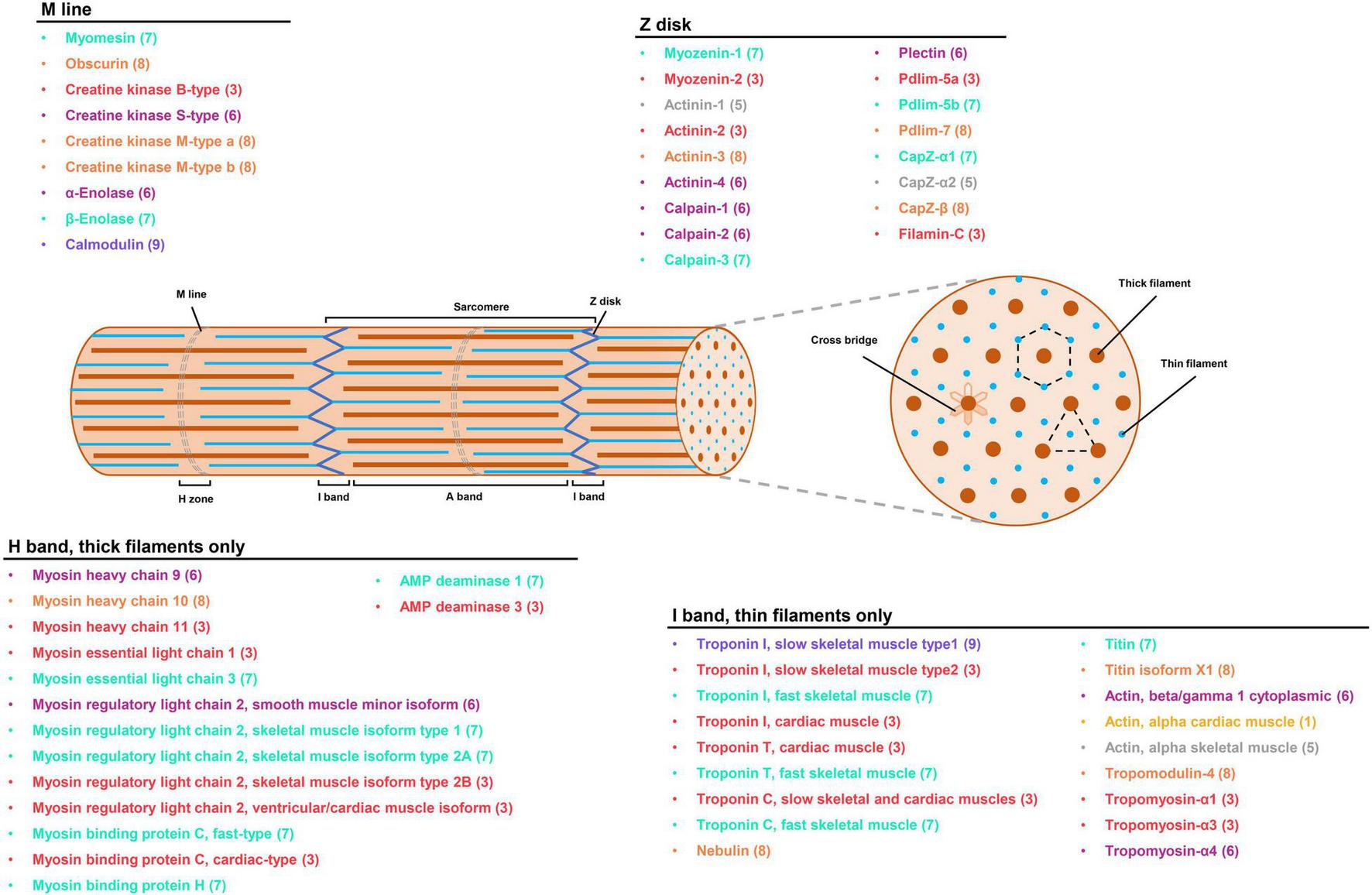 The expression profiles of myofibrillar proteins in P. dentex skeletal muscle by integrative transcriptome and proteome. Localization of myofibrillar proteins mapped onto the schematic of the sarcomere was predicted based on the published vertebrate counterparts (Estévez et al., 2012; Holland and Ohlendieck, 2013; Ochiai and Ozawa, 2020). The colors of fonts and numbers in parentheses represented gene expression information, corresponding to the quadrants distribution in Figure 5C.