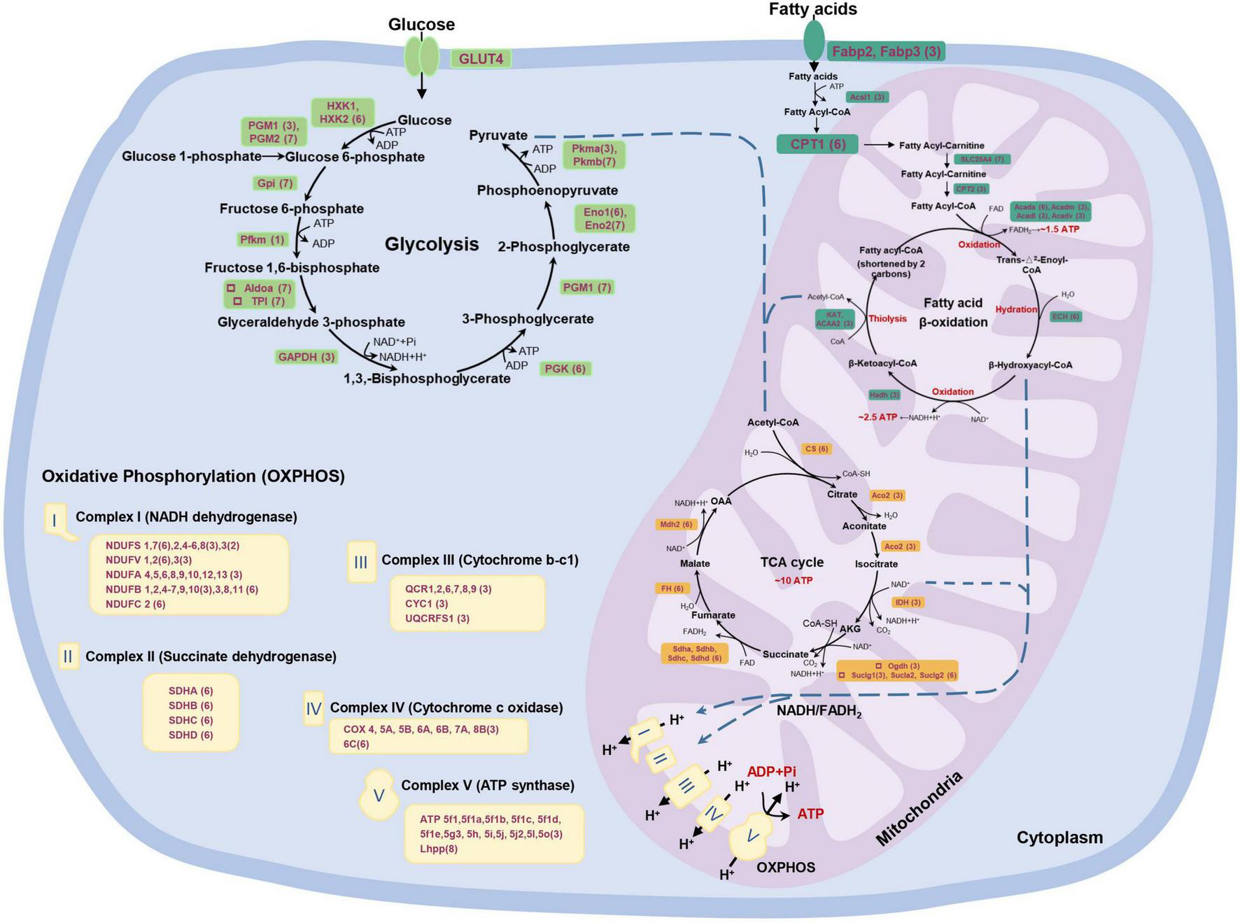 A global view of P. dentex skeletal muscle metabolism from the point of integrative proteome and transcriptome. The metabolic network includes glycolysis, fatty acid β-oxidation, tricarboxylic acid (TCA) cycle, and oxidative phosphorylation, all constructed by the Kyoto Encyclopedia of Genes and Genomes (KEGG) pathway. The expression information of each gene in P. dentex skeletal muscle is shown in parentheses, corresponding to the quadrant distribution in Figure 5C.