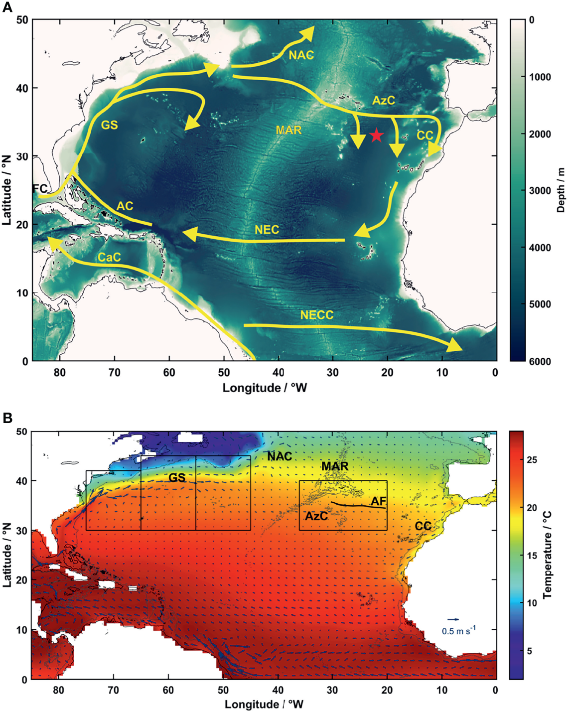 North Atlantic circulation at the surface. (A) Schematic representation of the North Atlantic Subtropical Gyre currents at the surface: Caribbean Current (CaC), Florida Current (FC), Antilles Current (AC), Gulf Stream (GS), North Atlantic Current (NAC), Azores Current (AzC), Canary Current (CC), North Atlantic Equatorial Current (NEC), and North Atlantic Equatorial Counter Current (NECC). Mid-Atlantic Ridge (MAR) and the Kiel 276 mooring (red star) are also identified (adapted from Tomczak and Godfrey, 1994 and Daniault et al., 2016). (B) Mean temperature and mean velocity at 5 m depth in the North Atlantic basin from the SODA-POP v2.2.4 (Carton and Giese, 2008; Giese and Ray, 2011) averaged between 1871 and 2010. Black boxes show our study domains in the Gulf Stream (between 75°W and 45°W, divided into three 10° sub-zones) and in the Azores Current (between 36°W and 20°W). A thin grey line depicts the 2000 m-isobath. The time-averaged annual position of the Azores Front (AF) position is represented by a thick black line between 30°W and 20°W for the period 1871-2010.