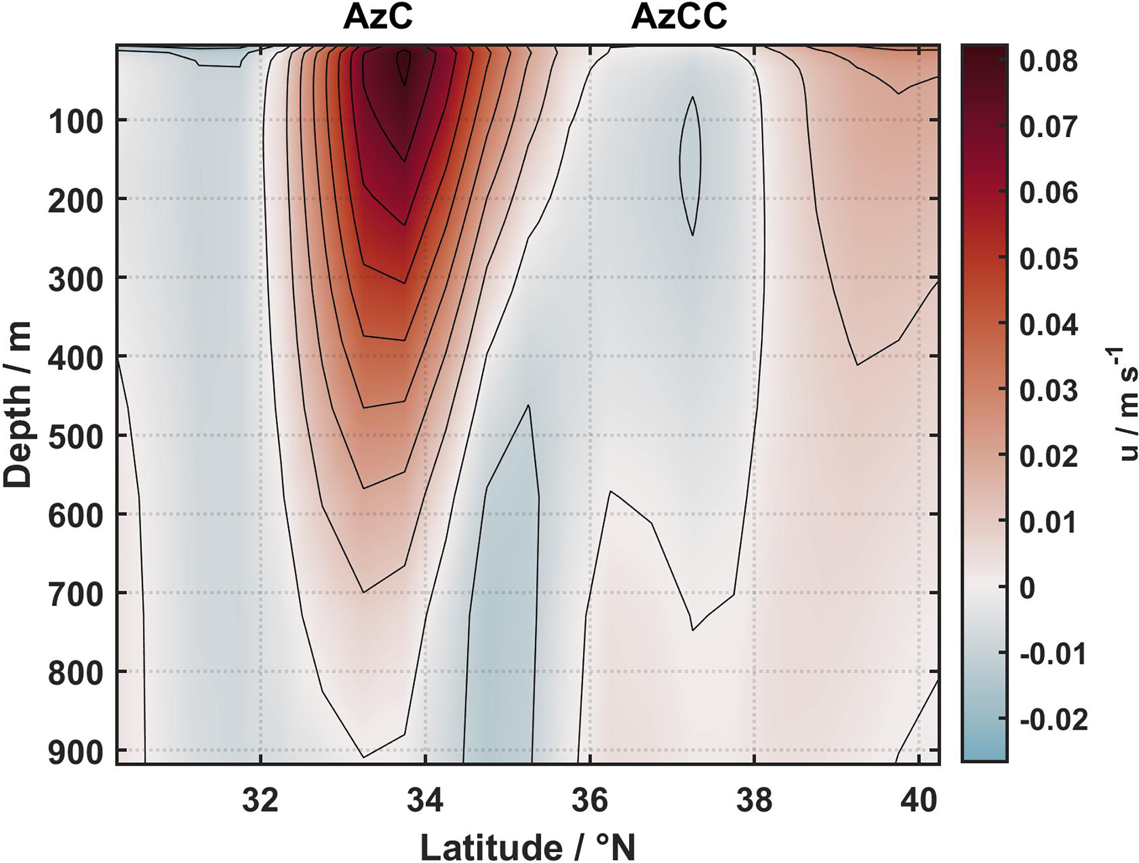 The Azores Current System. Average of the zonal velocity component at the Azores Current region between 36°W and 20°W (see Figures 1B) for the period 1871 and 2010. Positive values indicate eastward flow. The Azores Current (AzC) and Azores Countercurrent (AzCC; Onken, 1993) cores are identified.