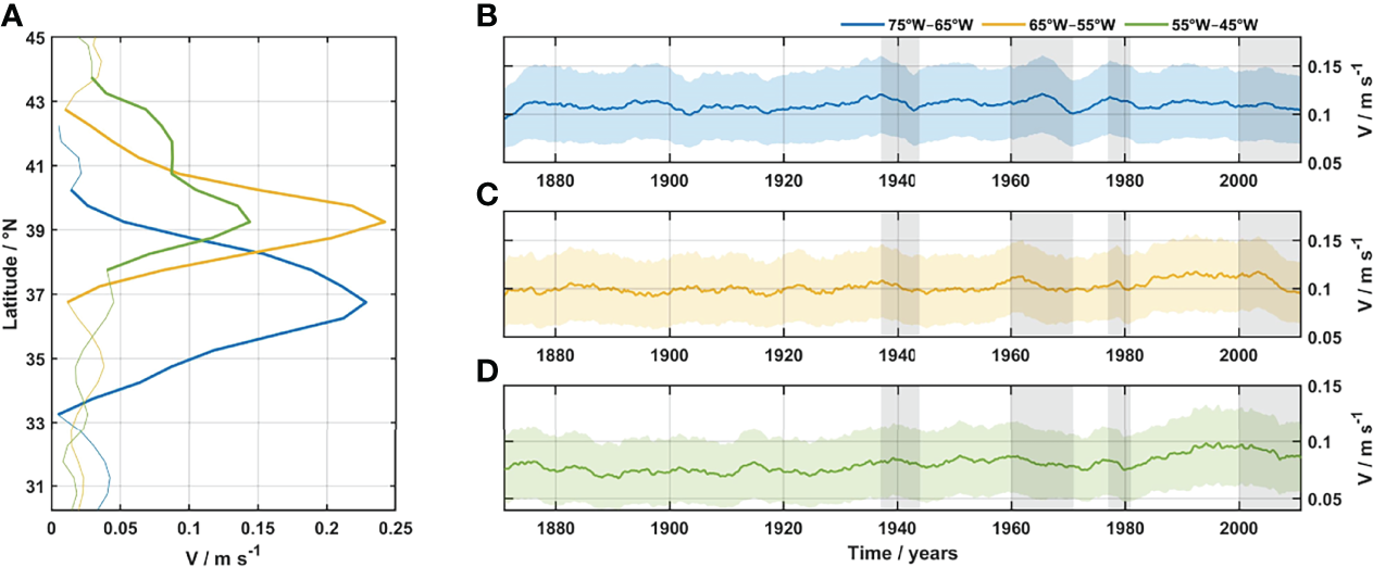 The Gulf Stream. (A) Meridional profiles of the absolute velocity averaged in the upper 1000 m for each sub-region along the Gulf Stream: western (75°W–65°W, blue line), central (65°W–55°W, yellow line), and eastern/extension (55°W–45°W, green line) zones. The Gulf Stream cores are marked with a thicker line for each region. (B) Averaged monthly time-series of absolute velocity at the western Gulf Stream, (C) central Gulf Stream region, and (D) extension Gulf Stream region inside the core in the upper 1000 m between 1871 and 2010. Colored shadowed areas in (B–D) represent the standard deviation. Shadow grey areas mark the periods of velocity decrease of the Gulf Stream. Absolute velocity was calculated from the monthly zonal and meridional velocity fields from SODA-POP v2.2.4 (Carton and Giese, 2008; Giese and Ray, 2011). The time-series are smoothed with a 60-months running mean.