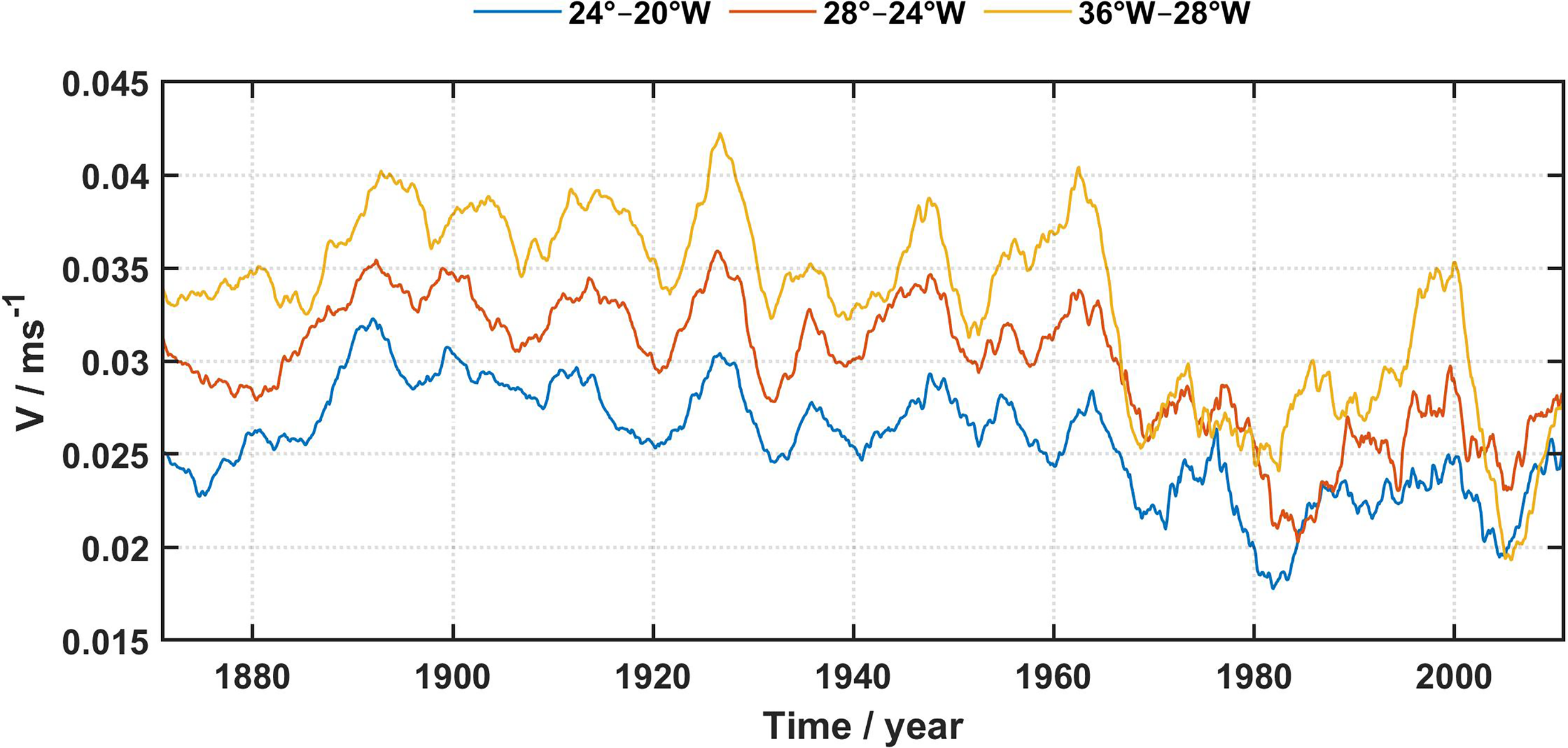 The Azores Current sub-regions. Monthly absolute velocity averaged inside the core of the Azores Current (between 32° and 36°N) in the upper 1000 m between 1871 and 2010. The Azores Current is divided into three sub-regions according to the eddy kinetic energy dynamic at the surface (Barbosa Aguiar et al., 2011; Silva-Fernandes and Peliz, 2020): western (36°W–28°W, yellow line), central (28°W–24°W, orange line), and eastern (24°W–20°W, blue line). All time-series are smoothed with a 60-months running mean.