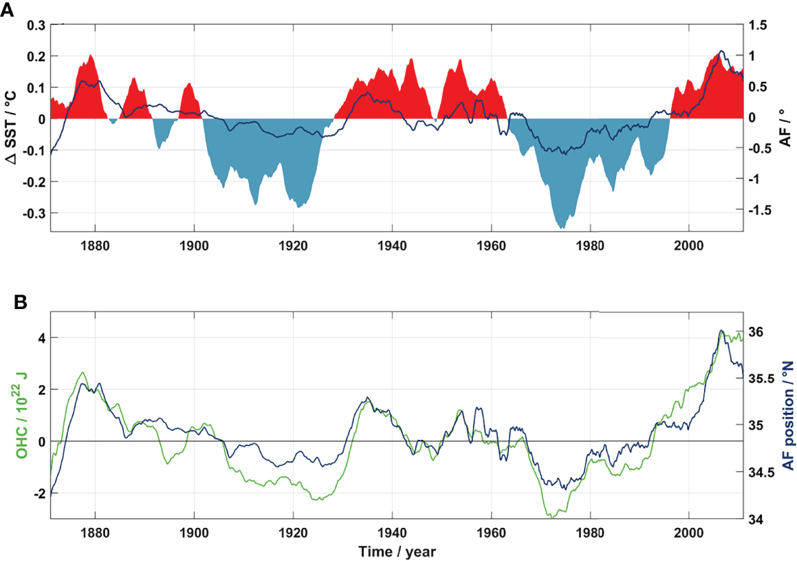 The Azores Front. (A) Monthly detrended Azores Front position (solid dark blue line) superimposed on the Atlantic Multidecadal Oscillation index (shadowed areas: positive phase in red; negative phase in blue). (B) Monthly Azores Front position (solid dark blue line) and integrated OHC in the upper 400 m (solid green line; details on the OHC calculation are given in Data and Methods). The Azores Front position is an average of all the Azores Front positions between 30°W and 20°W. The monthly detrended time-series was calculated by removing the linear trend for the entire period. All time-series are smoothed with a 60-months running mean.