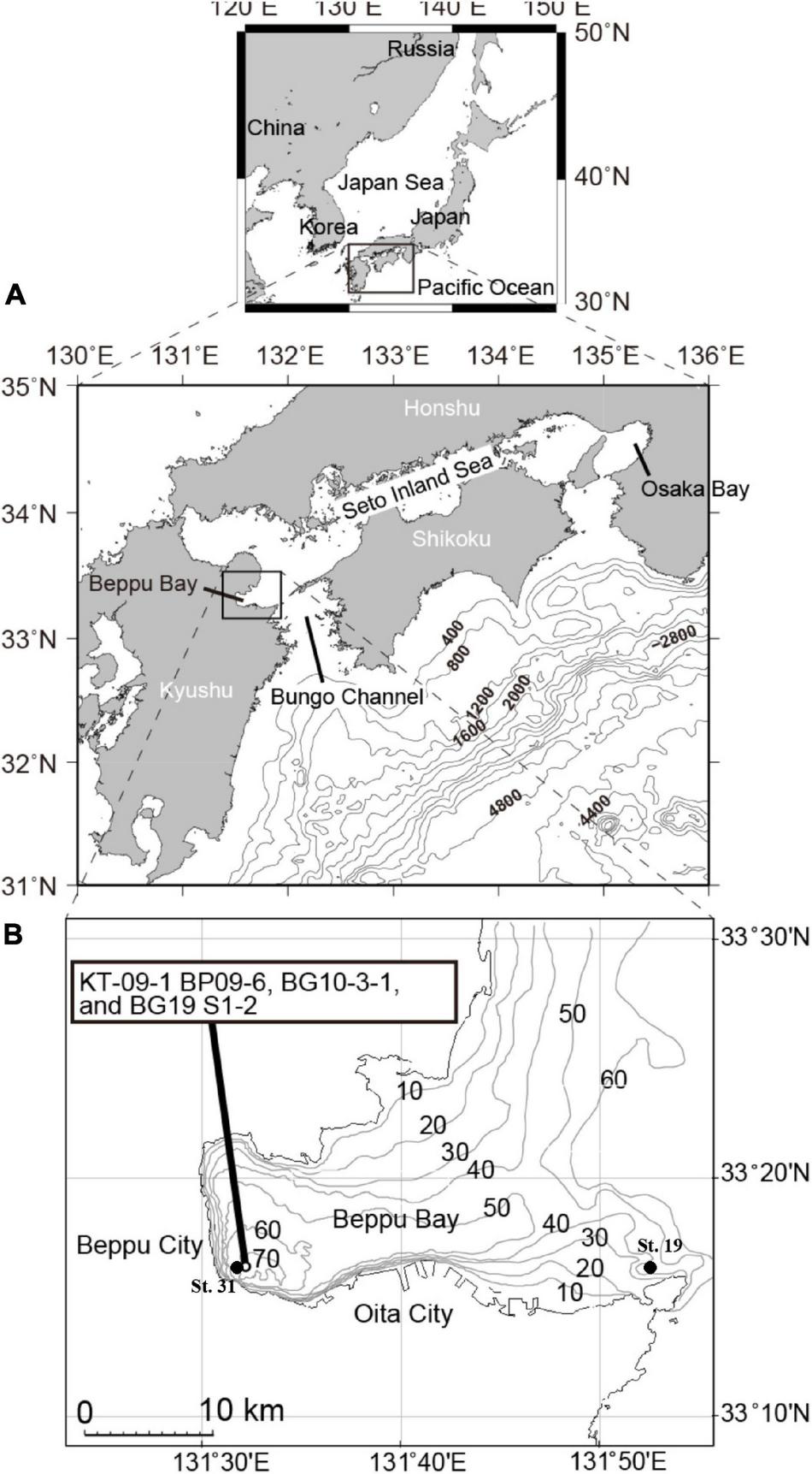 Beppu Bay, in the western Seto Inland Sea, northeast Kyushu, Japan (Figure 1) is one of the enclosed bays indirectly affected by the warm Kuroshio Current through Bungo Channel and Hyuga Nada. This bay also is the only basin located within the Japanese coastal zone which exhibits clear autumnal oxygen depletions in bottom waters (0–0.2 mg L–1) (Kameda and Fujiwara, 1995) as well as annual varve sedimentation during the late Holocene in the deepest area (Kuwae et al., 2013). Sediments in the area are continuously deposited with relatively high sedimentation rates (of 0.23–0.30 cm year–1) (Kuwae et al., 2013; Yamada et al., 2016). The high sedimentation rates have allowed for the precise dating of surface sediments using lead-210 (210Pb) (Takahashi et al., 2020) and the reconstruction of excellent proxy records of anthropogenic markers, including increases in concentrations of cesium-137 (137Cs) (Kuwae et al., 2013; Takahashi et al., 2020), polychlorinated biphenyls (PCB; Takahashi et al., 2020), dichloro-diphenyl-trichloroethane (DDT; Nishimuta et al., 2020), brominated fire retardants (Hoang et al., 2021) and microplastics (Masumoto et al., 2018) since year 1950. There are cities in the coastal area around Beppu Bay, Oita City in the south and Beppu City in the west, and an orchard area in the north (Kuwae et al., 2022). The Ohno and Oita Rivers, which drain the Oita Plain, are major rivers discharging to Beppu Bay (Yamada et al., 2016). Thus, this bay is one of most well-investigated sites for understanding anthropogenic activities in the world (Anthropocene Working Group, 2020).