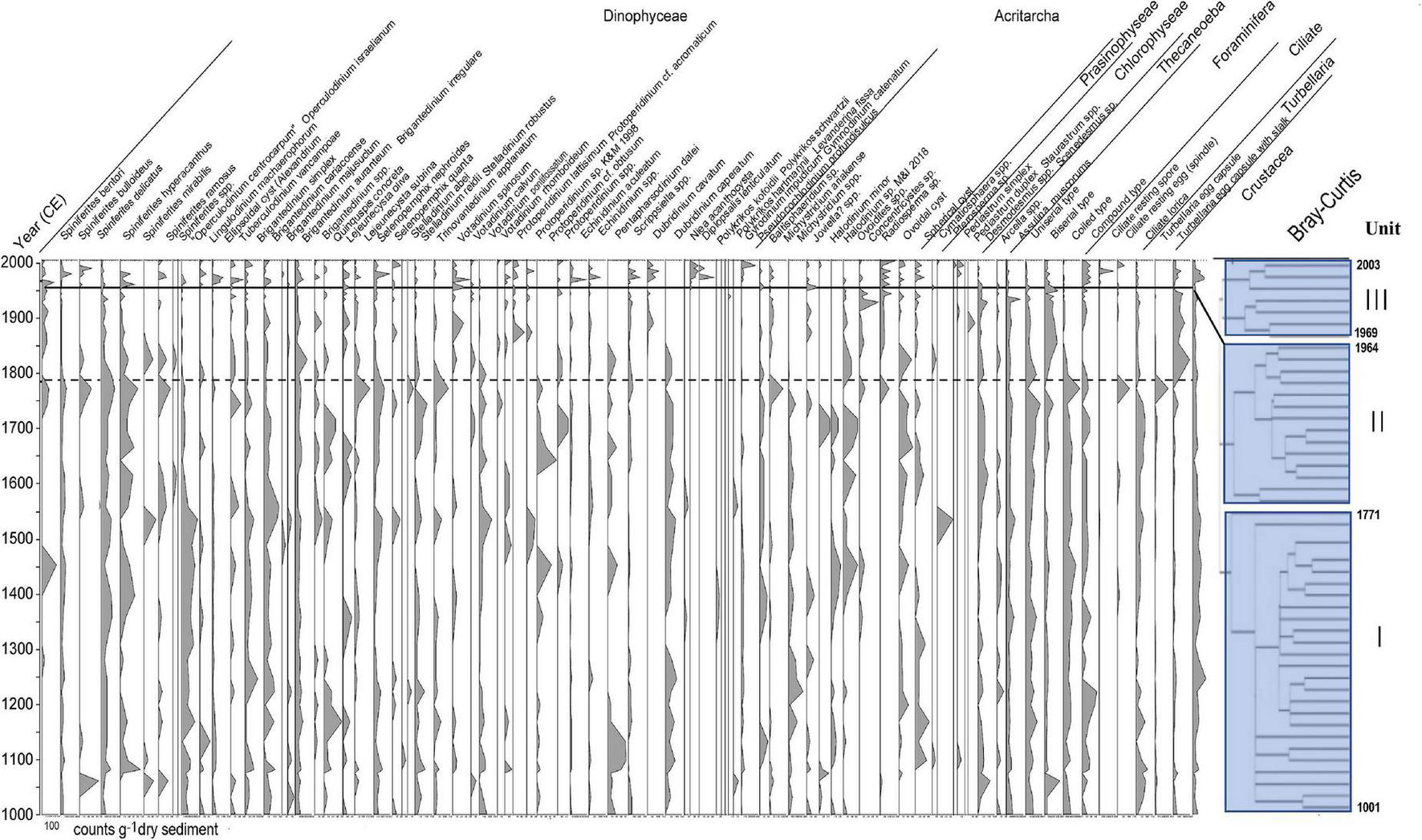 Stratigraphic distribution of all aquatic palynomorphs observed in the core samples of Beppu Bay and Unit division based on stratigraphic cluster analysis using Bray-Curtis method.