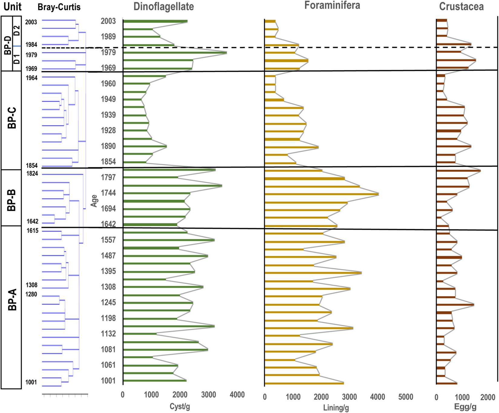 Stratigraphic distribution of major aquatic palynomorphs (dinoflagellate cysts, microforaminiferal linings and crustacean resting eggs) observed in the core samples of Beppu Bay. Unit division in the left column based on the result for dinoflagellate cyst assemblages according to stratigraphic cluster analysis using Bray-Curtis method.