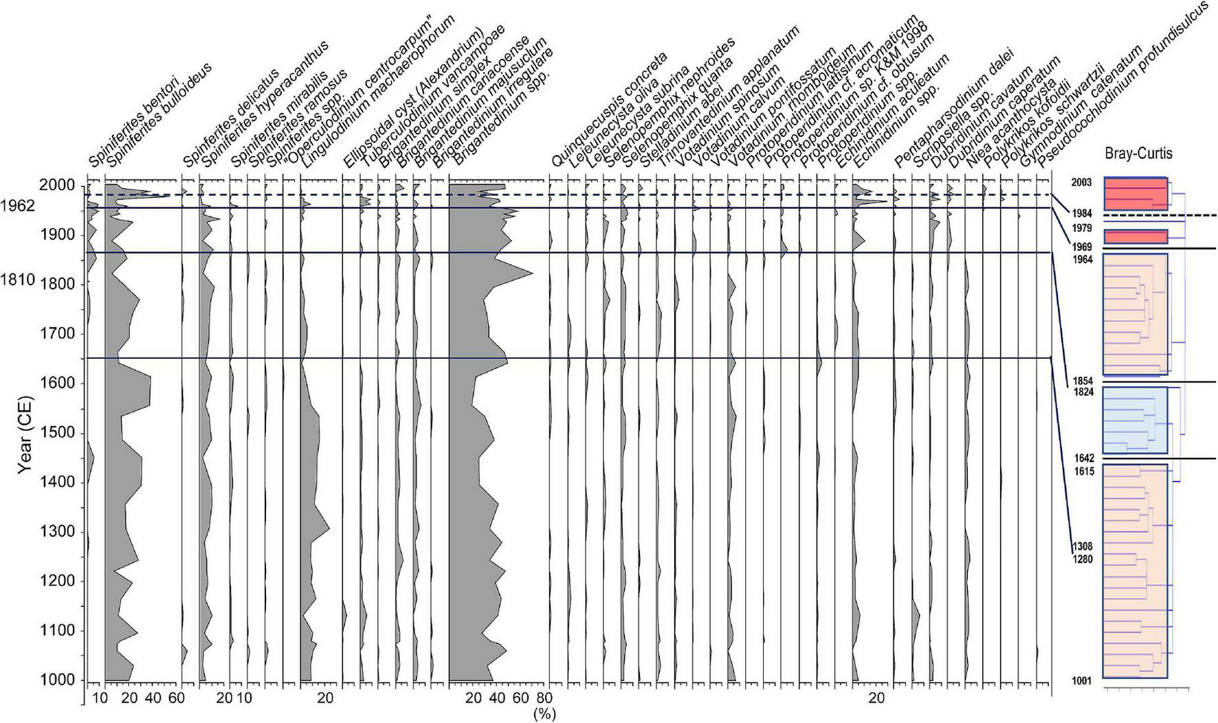 In Gonyaulacales, Spiniferites (mainly S. bulloideus and S. hyperacanthus) were dominant, accounting for more than 90% of Gonyaulacales in year 1979. In addition, S. bentori constituted nearly 20% from year 1964 to 1984. Lingulodinium machaerophorum was abundant before year 1824, accounting for more than 40% of Gonyaulacales in year 1222 and 1557. Tuberculodinium vancampoae was also observed in almost all samples, although its densities were relatively low. The appearance of Operculodinium centrocarpum sensu Wall and Dale was very low.