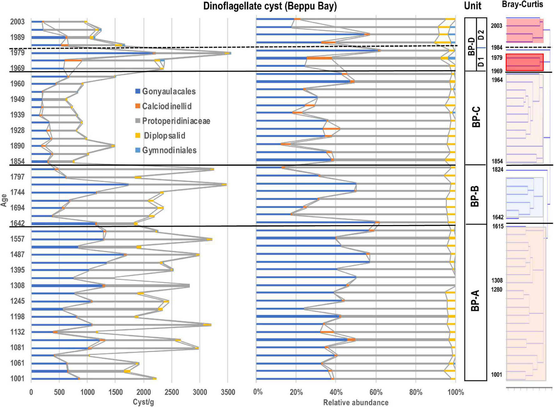 The results of the cluster analysis using the aquatic palynomorph assemblage data of Beppu Bay core revealed that these palynomorph assemblages were stratigraphically divided into three major units: BP- I Unit, BP- II Unit, and BP- III Unit. The boundaries were placed at year 1771 between BP- I Unit and BP- II Unit, and year 1964 between BP- II Unit and BP- III Unit (Figure 2).