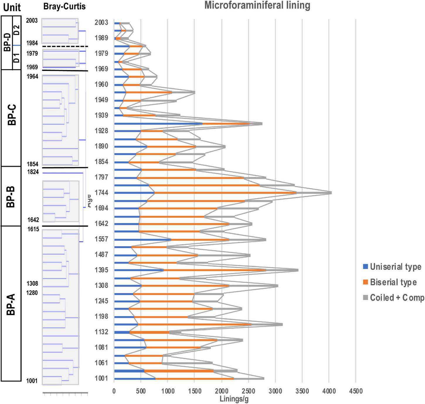 Stratigraphic distribution of microforaminiferal linings. Unit division in the left column based on the result for dinoflagellate cyst assemblages resulting from stratigraphic cluster analysis using Bray-Curtis method.