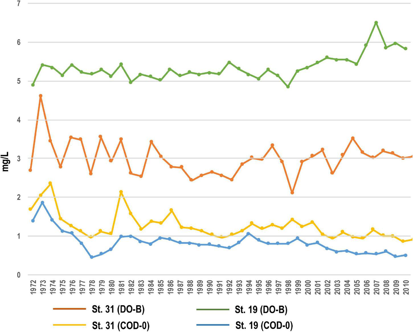 Data of Dissolved Oxygen (DO) and Chemical Oxygen Demand (COD) in the inner and mouth parts of Beppu Bay (St. 31 and St. 19 of the shallow sea constant line survey (Senkai Teisen Chosa; STC) in Japanese) respectively measured at STC carried out by the Oita Prefectural Fisheries Research Department was employed, however, these data were left from year 1972 onward only.