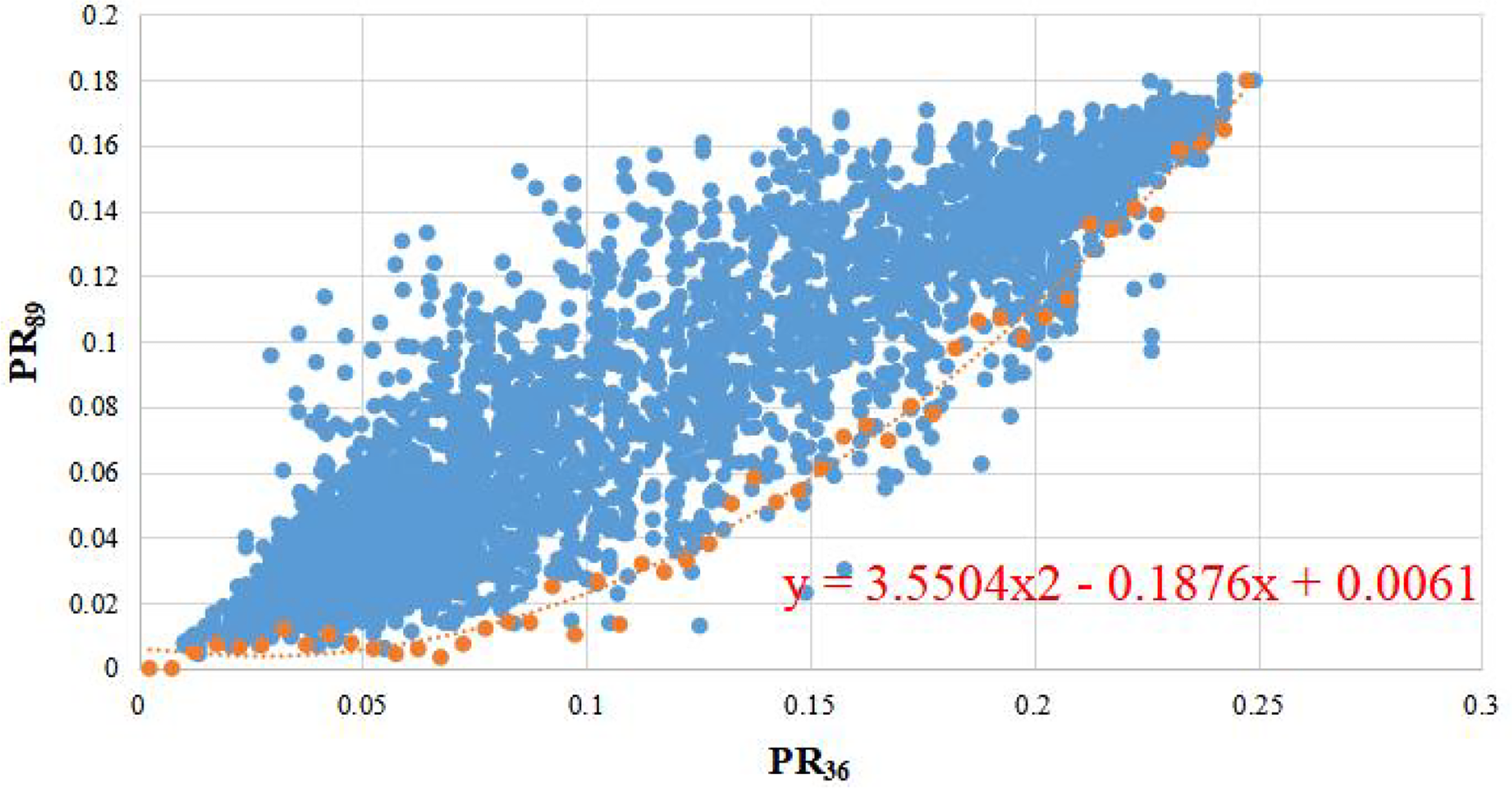 The external environment such as cloud and water vapor basically has no impact on the 36-GHz brightness temperature data, but has a great impact on the 89-GHz brightness temperature data. Under sunny weather, the Polarization Ratio(PR) of the 89-GHz brightness temperature data and the 36-GHz brightness temperature data is stable (Iwamoto et al., 2013). But when there is external interference such as cloud and water vapor, the PR of the 89-GHz brightness temperature data and the 36-GHz brightness temperature data will be reduced, and the degree of reduction is related to the impact of the external environment such as cloud and water vapor. The PR value is obtained as shown in equation (1). Therefore, under sunny weather, take the PR of the 36-GHz brightness temperature data as the abscissa and the PR of the 89-GHz brightness temperature data as the ordinate, and draw the PR scatter plot, as shown in Figure 1. In the PR scatter plot, the abscissa is equally divided into several intervals, and the average value and standard deviation of the ordinate in each interval are calculated. Then, the best fitting curve based on the least square method is drawn by subtracting the value of twice the standard deviation from the average value in each interval, which is similar to the quadratic equation.